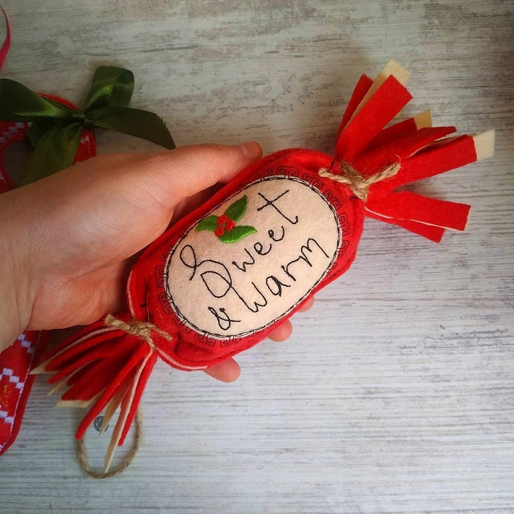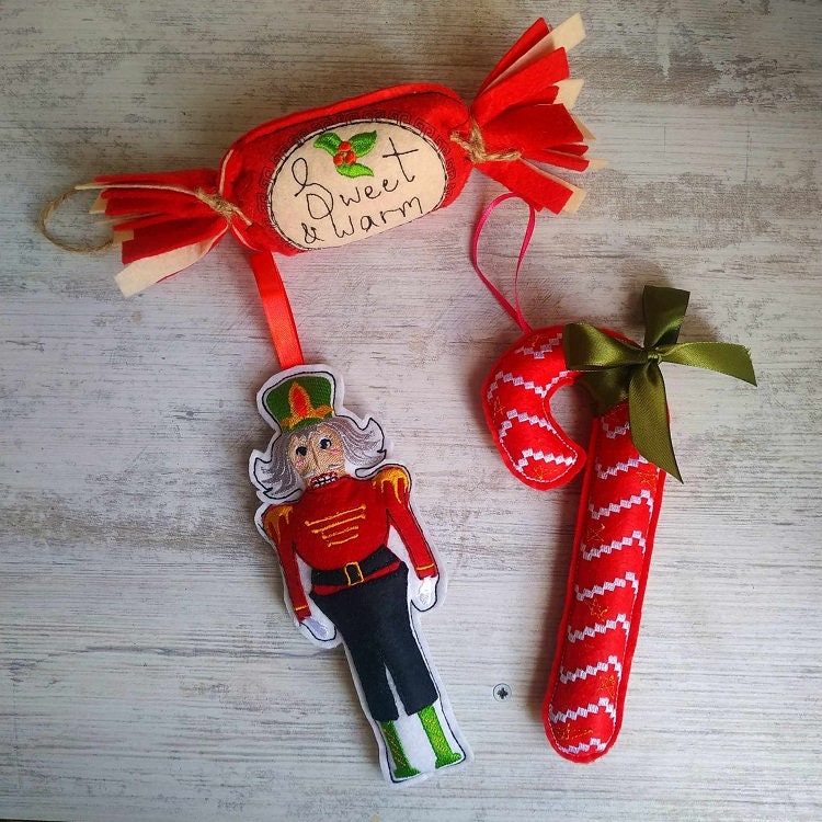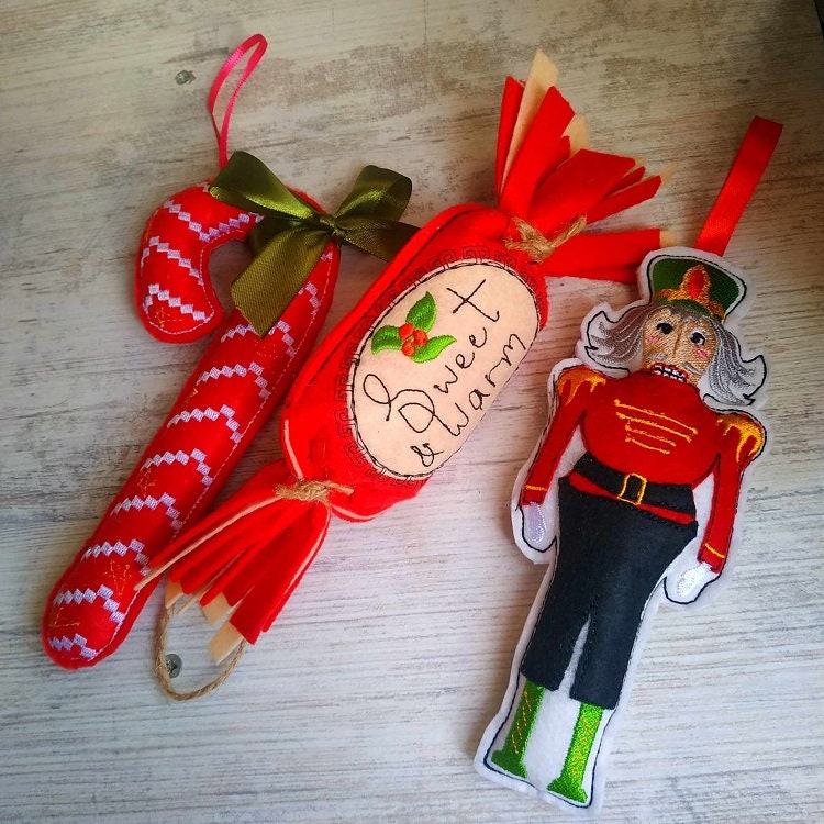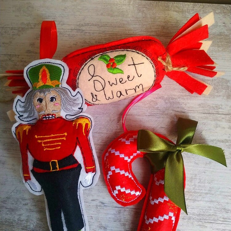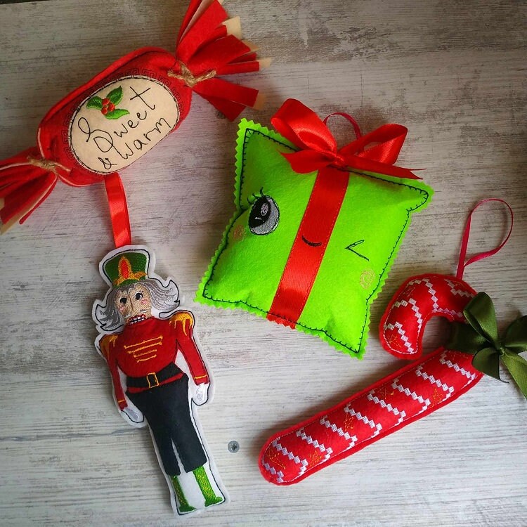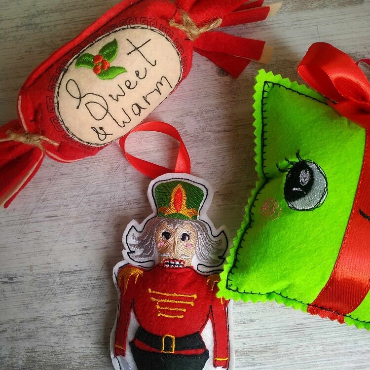 This set includes four ith felt projects: nutcracker, warm candy, cute gift and candy cane. They are completed in the hoop with a little handsewing inclusion.