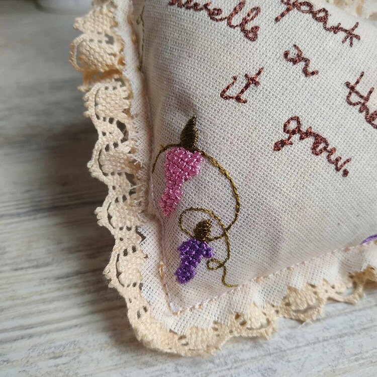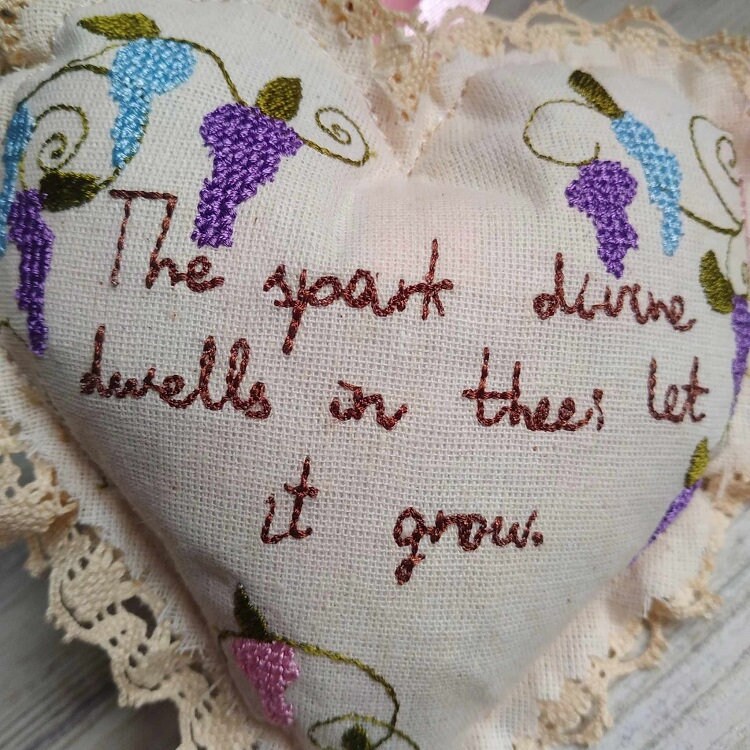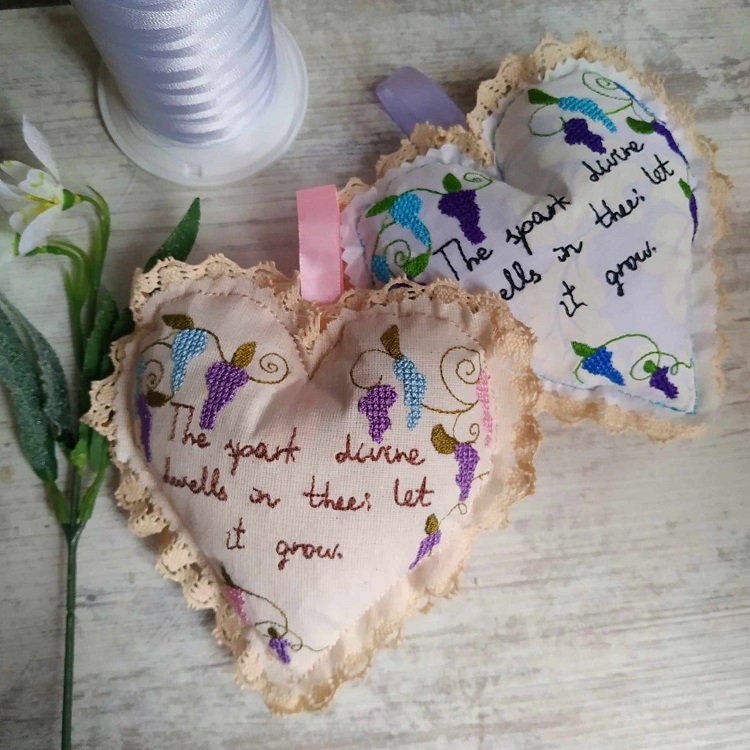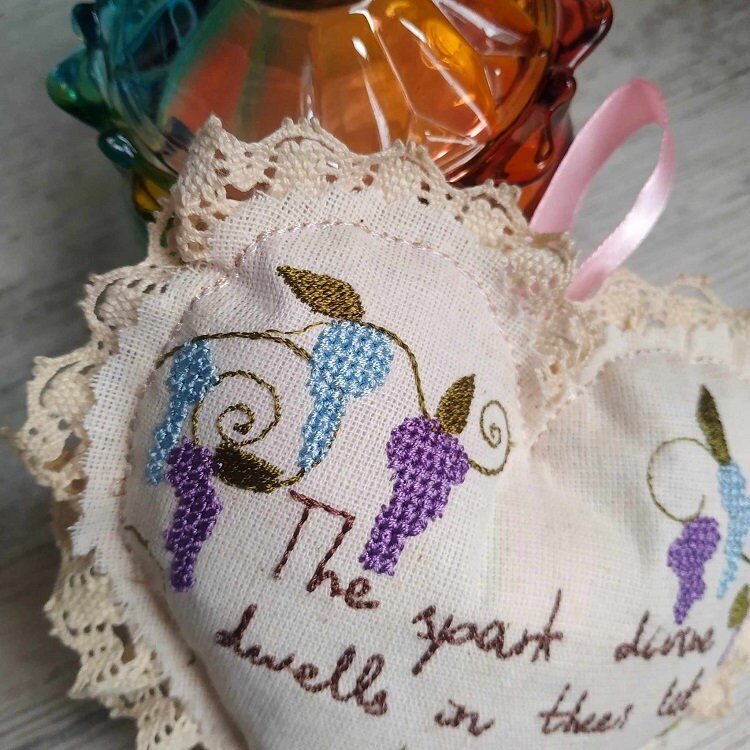 Lacy vintage heart done completely in the hoop with a little handsewing inclusion. Laces finish is attached in the hoop as well in a few steps easy to follow and described in the instructions.
