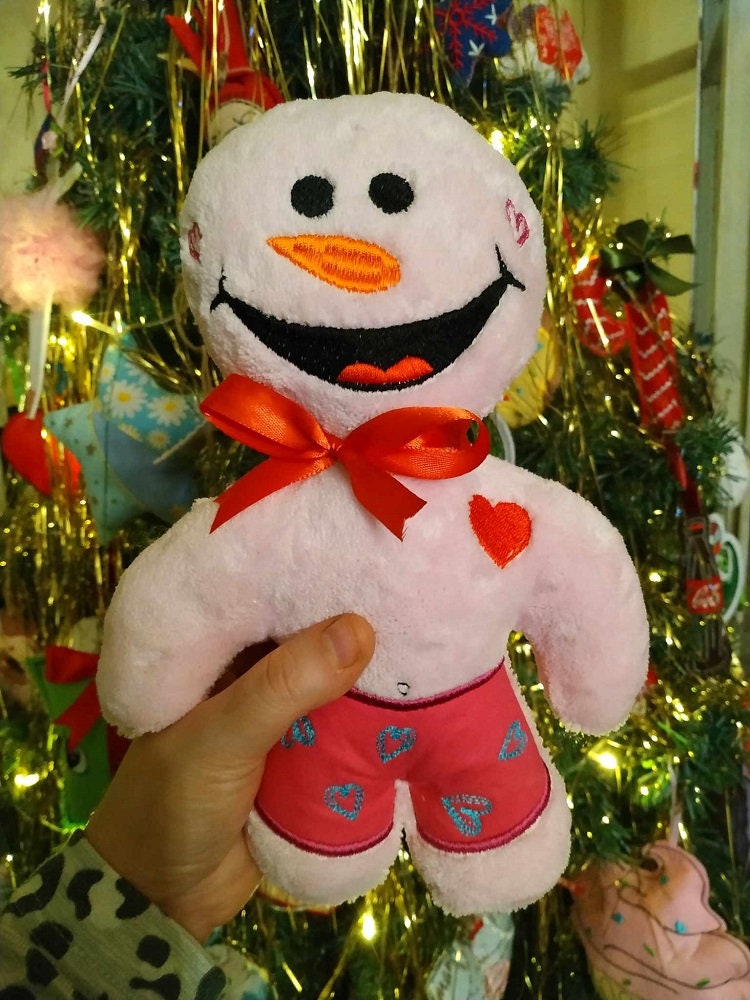 Cute Valentine snowman done completely in the hoop with a little handsewing inclusion.