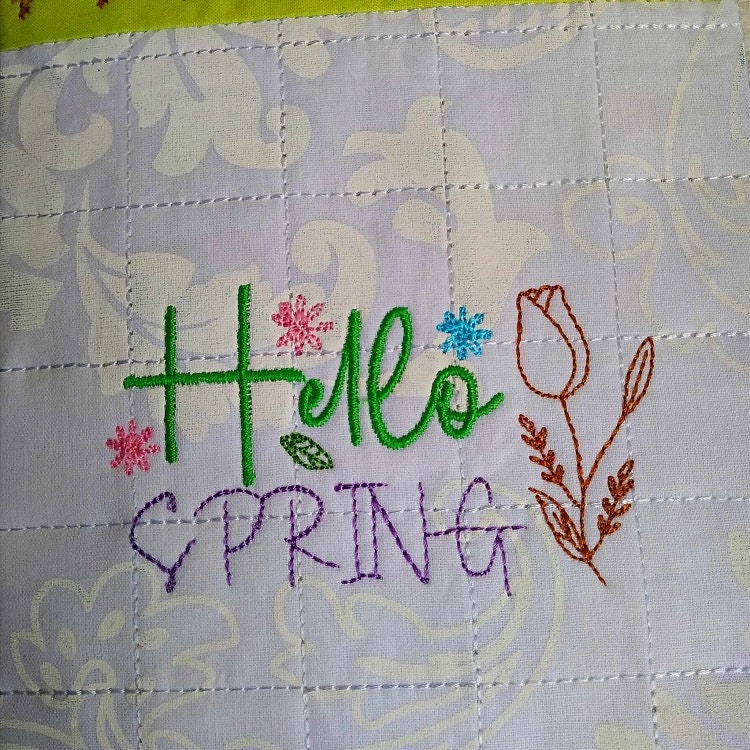 Hello spring mugrug - done completely in the hoop with no additional sewing. Has a pocket back. This mugrug brings the feeling of spring and is easy to make.