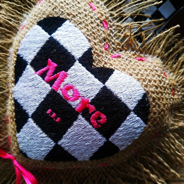 Burlap heart done completely in the hoop with a little handsewing inclusion.