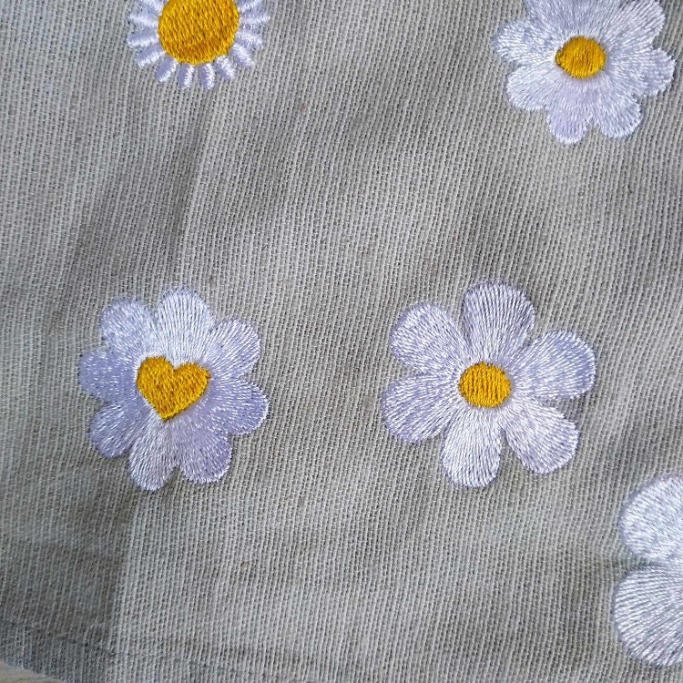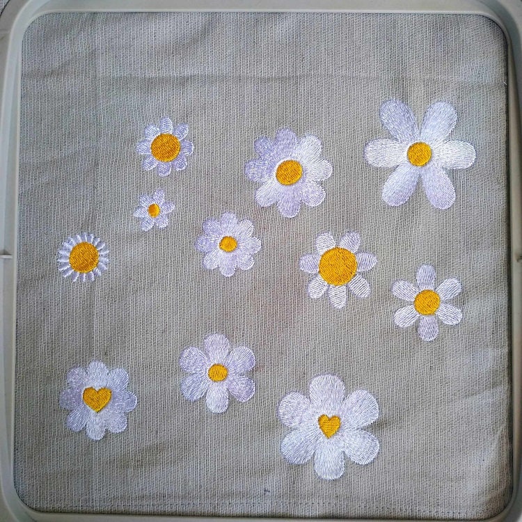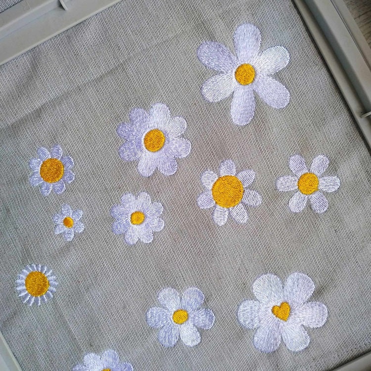 11 separate ones with each daisy on it (designed for 100x90mm hoops but possible to stitch in 5x5) and 1 design (8x8 hoops) that has grouping of all daises together. They are possible to be stitched on a napkin or table runner, tea towels, tote bags, clothes etc. Also you can group them of your taste and have some fun making your kind of original groupings with separate daises.