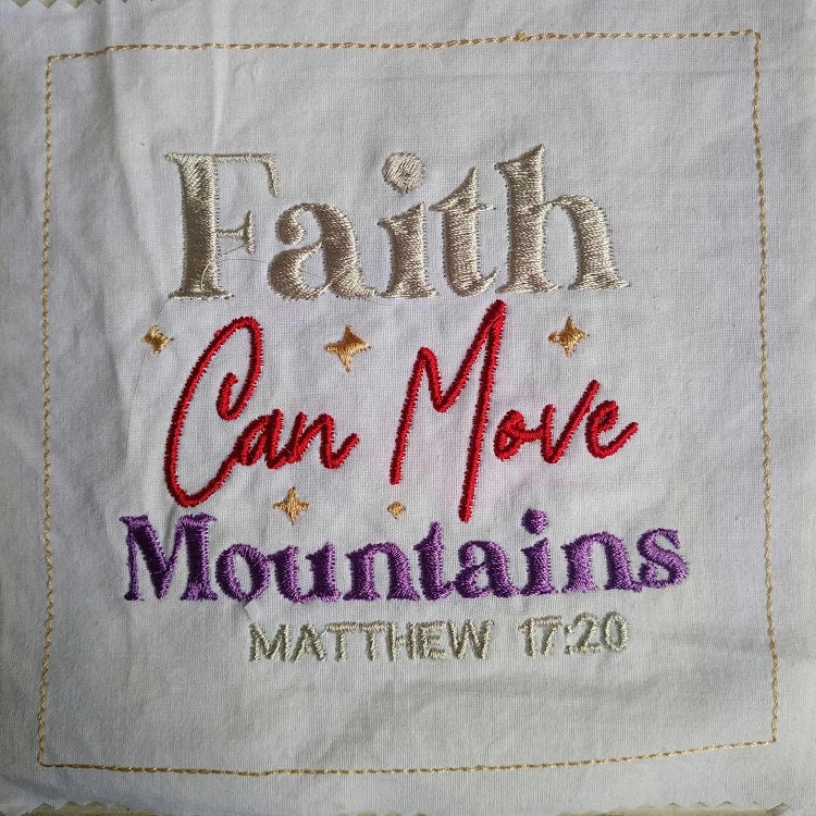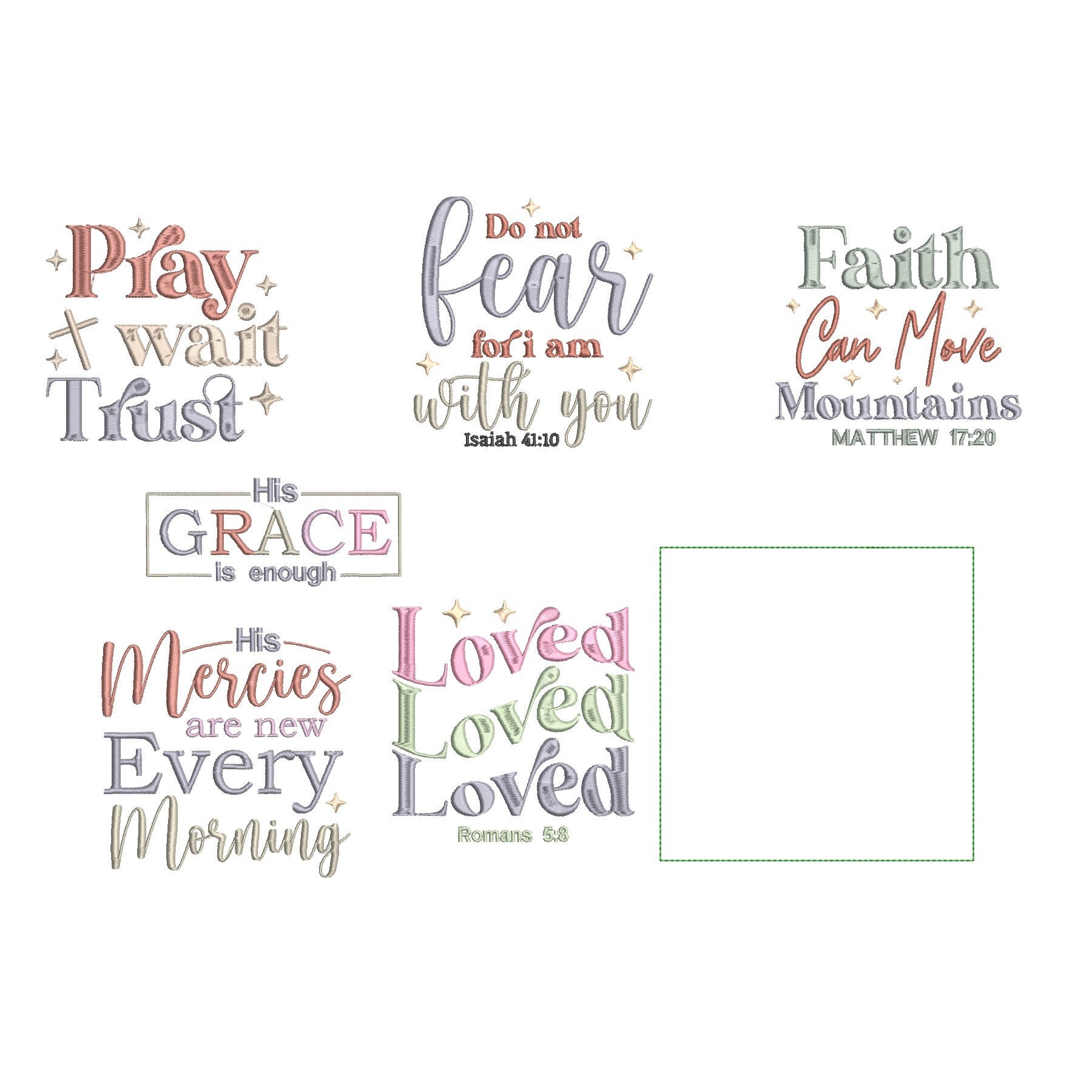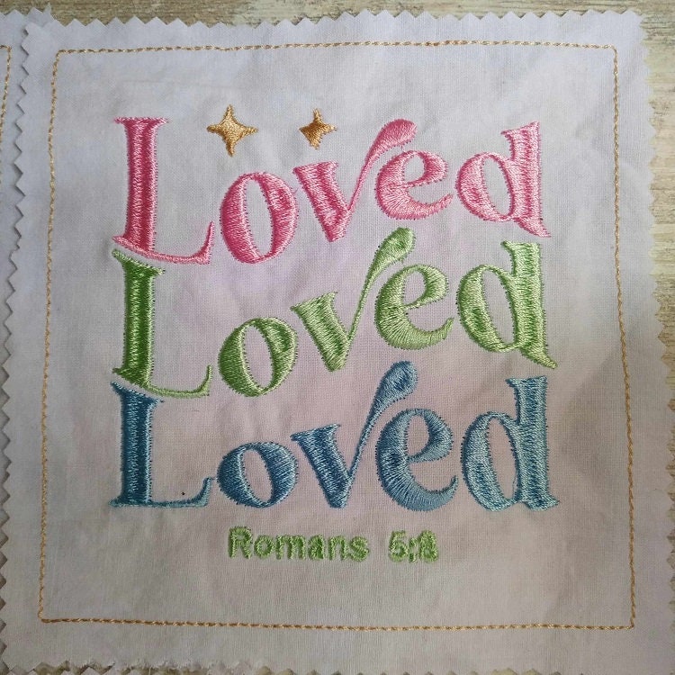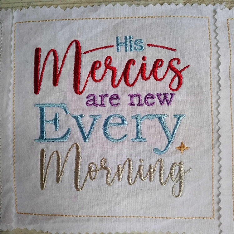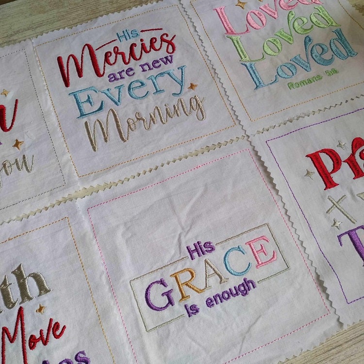 Beautiful biblical sayings - 6 designs plus the square shape, so you can turn these designs into blocks. You may choose to turn these blocks into projects of your choice: a centerpiece, runner or just stitch plain designs on the tea towels without the square shape.