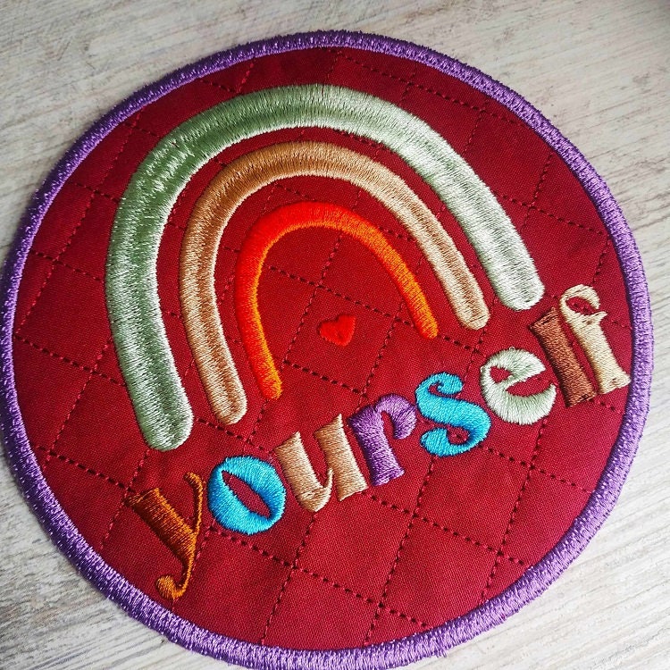 Inspiration "Love yourself" coaster that is done completely in the hoop without additional sewing.