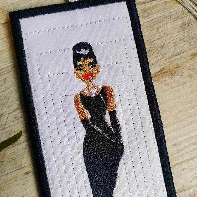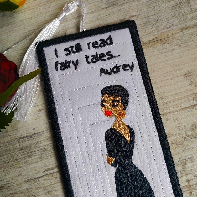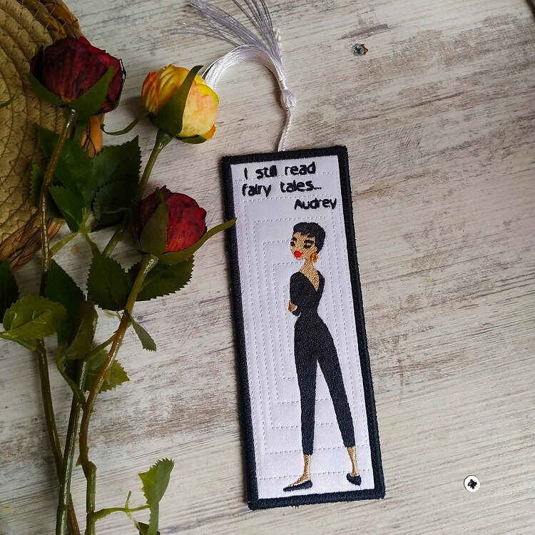 Classy Audrey Hepburn bookmarks - 2 designs. The tassel pattern is not included in this design. These bookmarks are done completely in the hoop without additional sewing.
