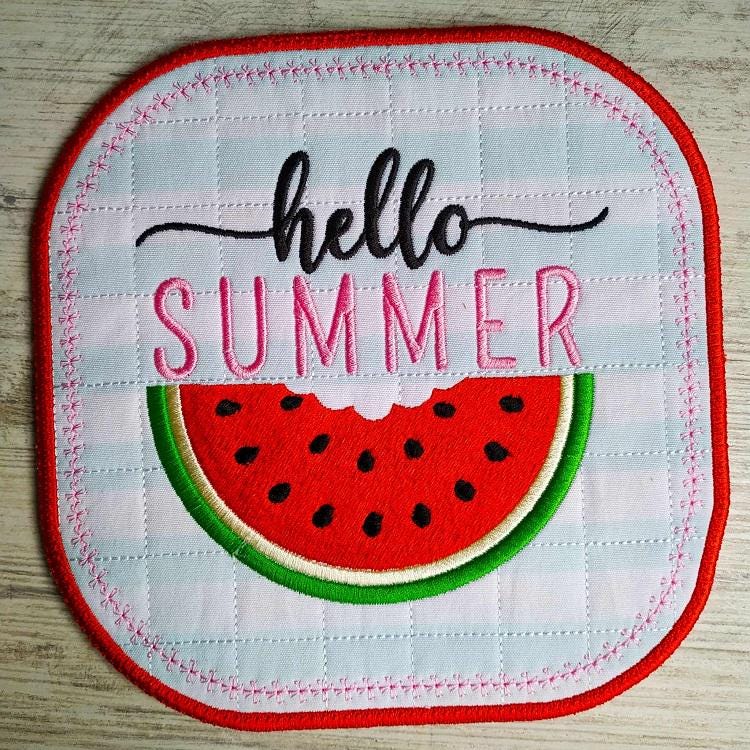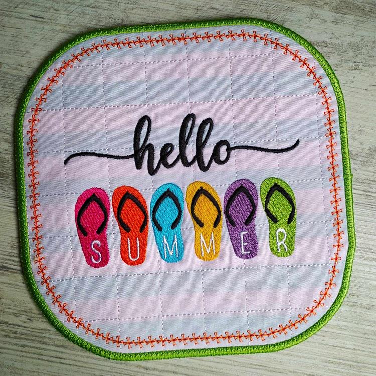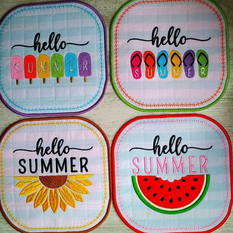 This set of summer projects contain 4 ITH big coasters and 1 ITH bookmark designs. Each of these is made completely in the hoop without additional sewing.