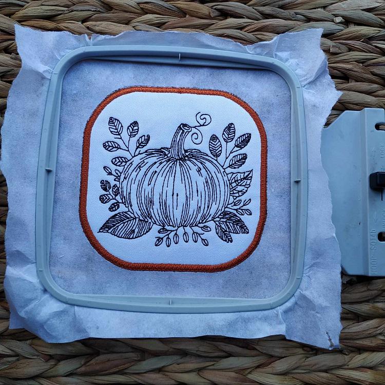 Pumpkin coaster that is done completely in the hoop without additional sewing. After you stitch this you or your kids can color it with the fabric marker, big fun to do!