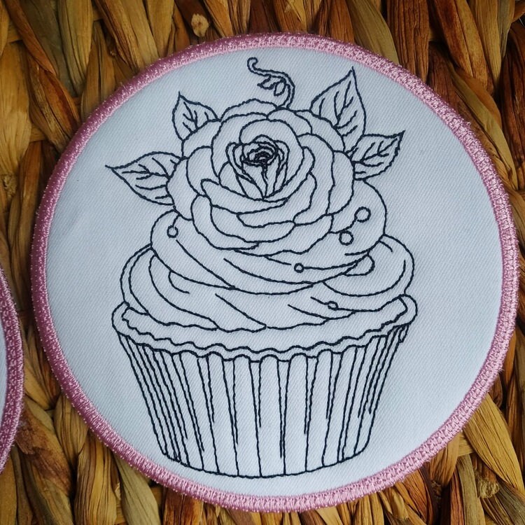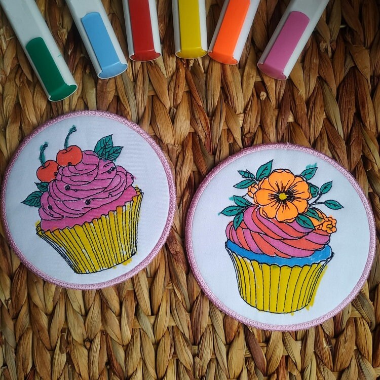 This cute set of cupcake coasters are done completely in the hoop. They are designed for coloring them with the fabric markers.