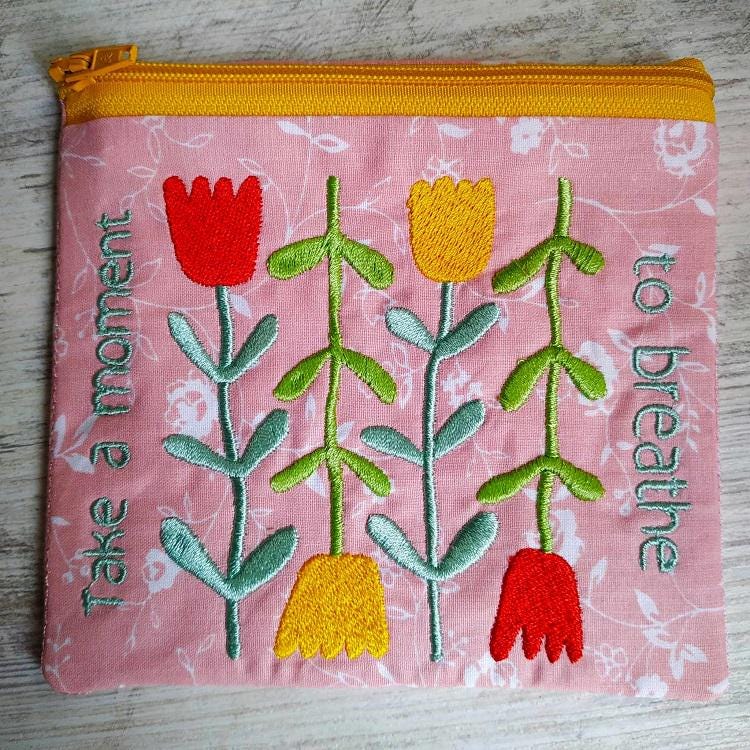 Fully lined zipper purse down completely in the hoop with a little handsewing inclusion.