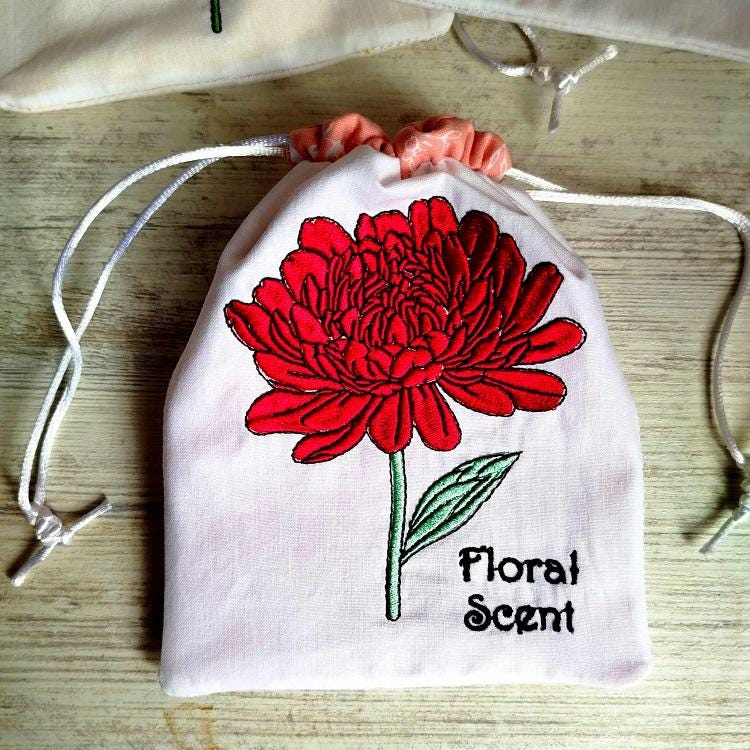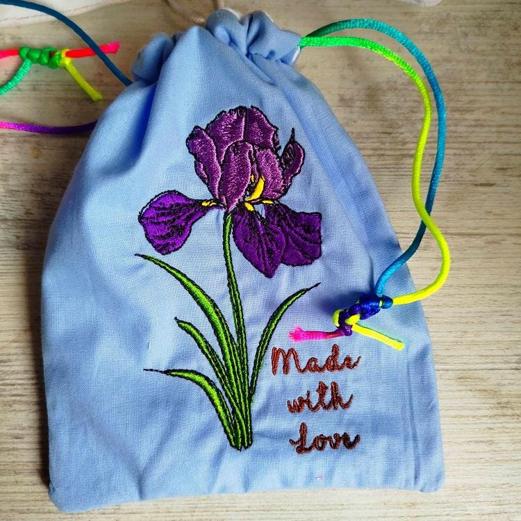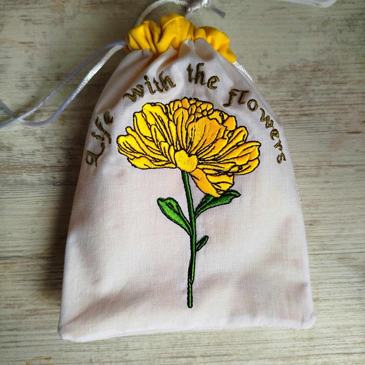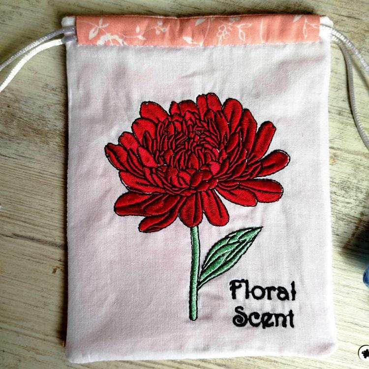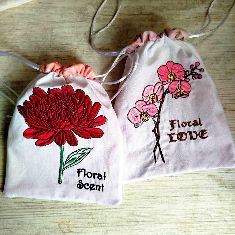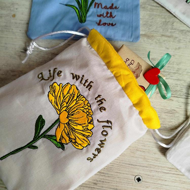 Drawstring bags - four designs - made in two hoopings with a little handsewing inclusion. Fun to make and good idea for the gifts wrapping. You can also keep soap, perfume in it or turn it into potpourri bag.