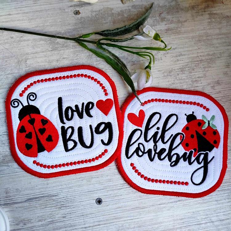 Cute lovebug coasters - 2 designs - made completely in the hoop. Make beautiful gifts for people we love and kids we call "Lovebugs".