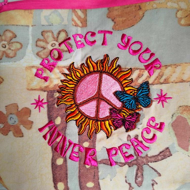 Protect your inner peace purse done completely in the hoop with a little handsewing inclusion.
