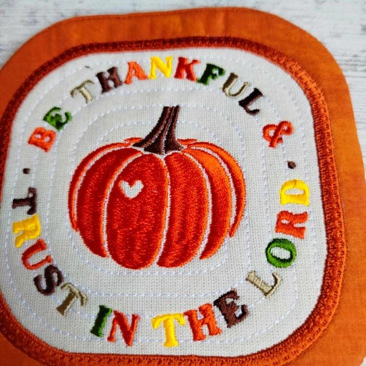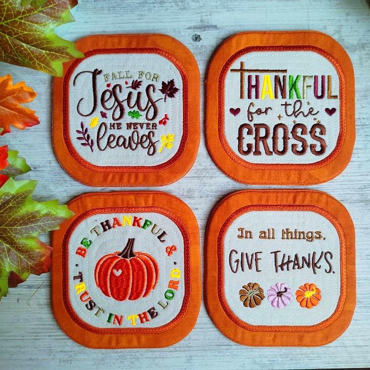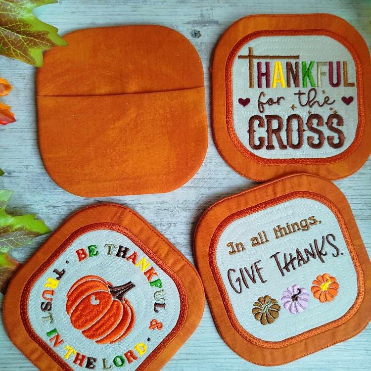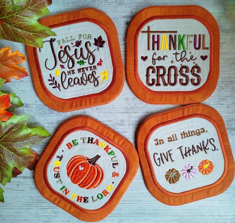 Four square mugrugs designs on the inspirational topic for thanksgiving or fall topic. They have pocket back and are easily made in the hoop.