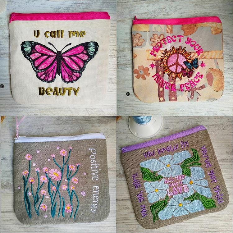 Beautiful Inspirational Fully lined 4 purses set - made in the hoop with a little handsewing inclusion.