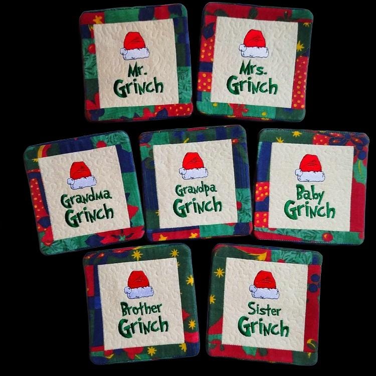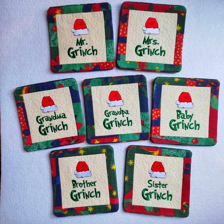 Christmas Grinch Family mugrugs - 7 designs with the pocket backs.