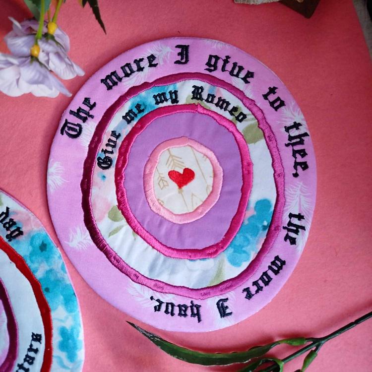 Romantic two coasters of Romeo and Juliet - made completely in the hoop without additional handsewing.