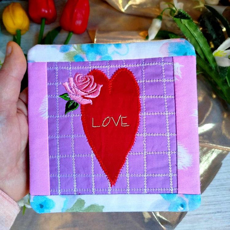 Beautiful love coaster - made completely in the hoop without additional handsewing.