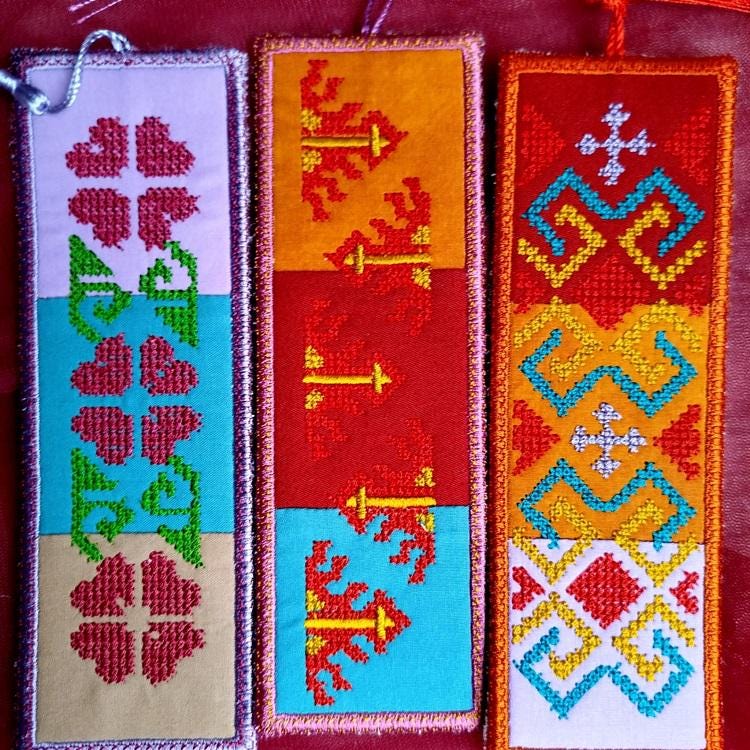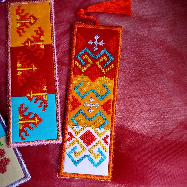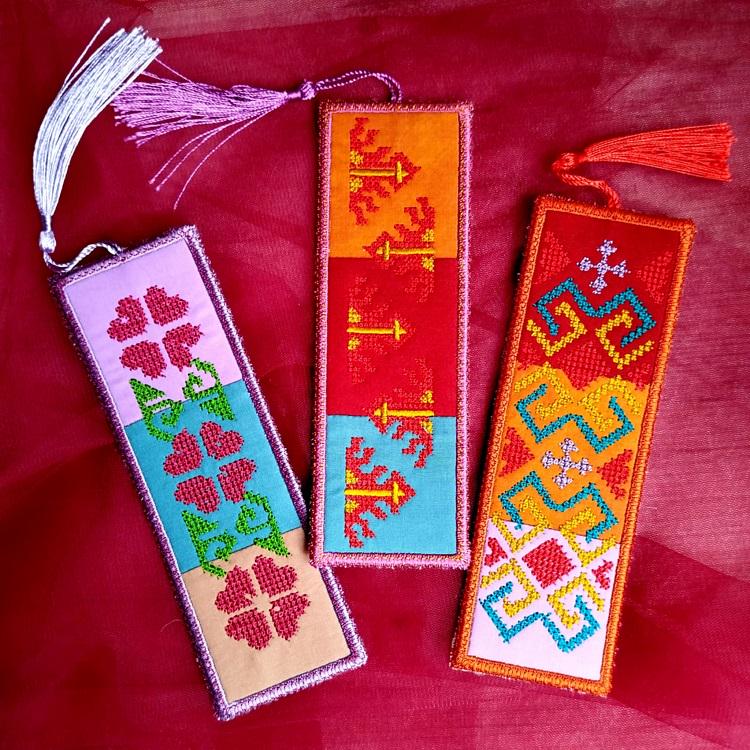 Bookmarks where quilt meets European Georgian pattern. Khevsuruli is the origin of such beautiful Georgian pattern. This is made in the hoop and includes three of such designs.