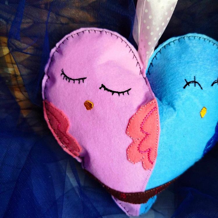 Valentines romantic felt heart with two cute birds - made in the hoop with a little handsewing inclusion.