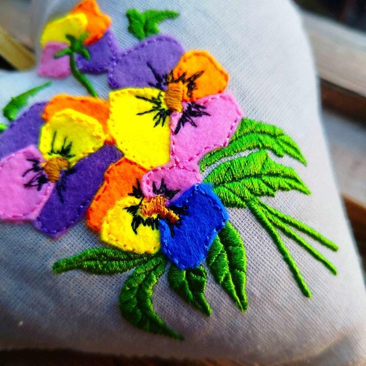 Beautiful felt applique pansy heart - made in the hoop with a little handsewing inclusion.