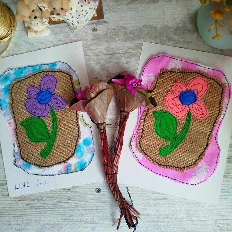 Applique Greeting card that is stitched with fabric, burlap and felt (on thin side felt recommended) and then glued to the cardboard postcard.