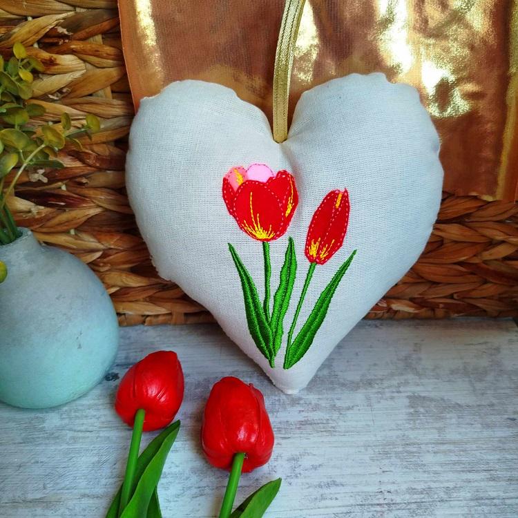 Beautiful felt applique tulip heart - made in the hoop with a little handsewing inclusion.