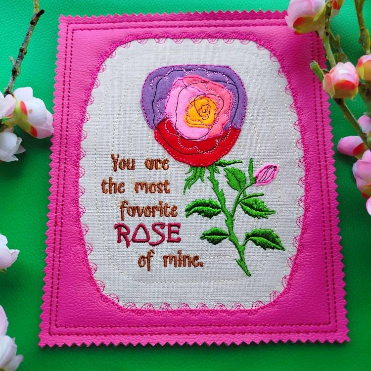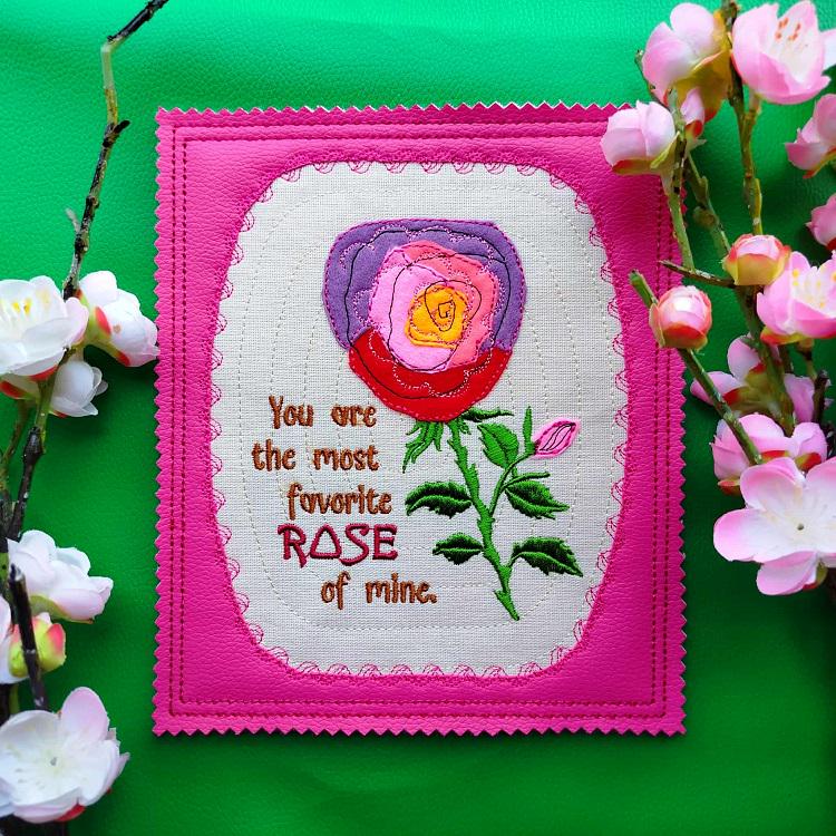 Special Rose (felt) applique card with an inspirational message on it that is made completely in the hoop.