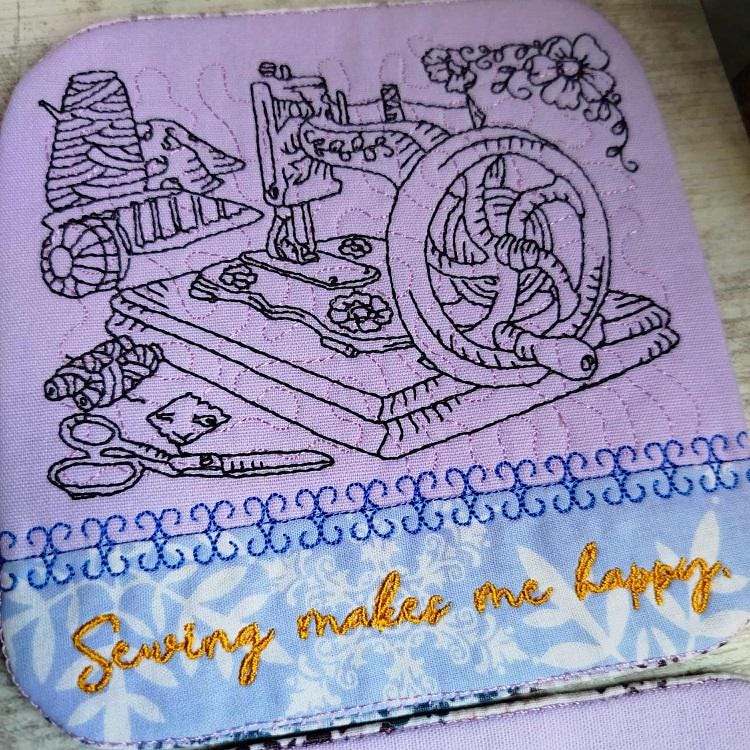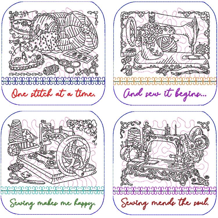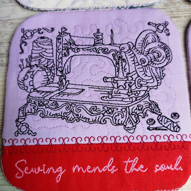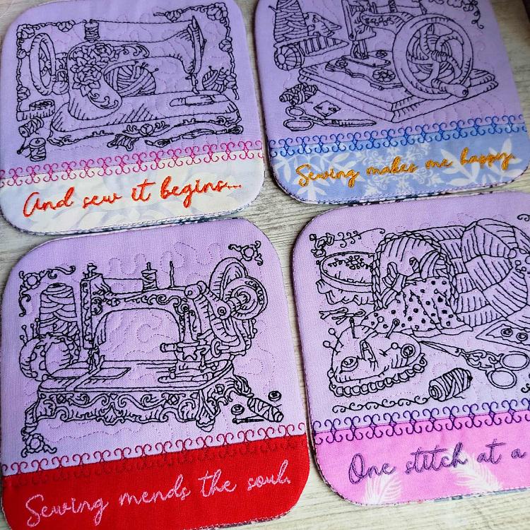 Sew pretty coasters - 4 designs - made completely in the hoop. They have pocket backs and sewing inspirational messages. Easy to make and fun to have!