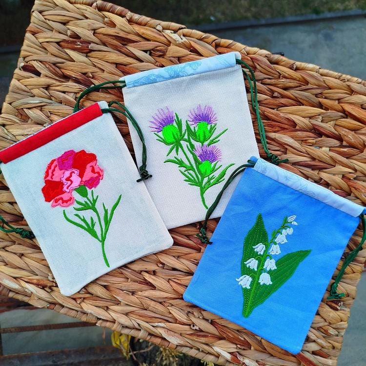 This is the second set of such floral applique bags the first set with the other floral appliques you can find at my shop with the title "ITH Floral applique drawstring bags".