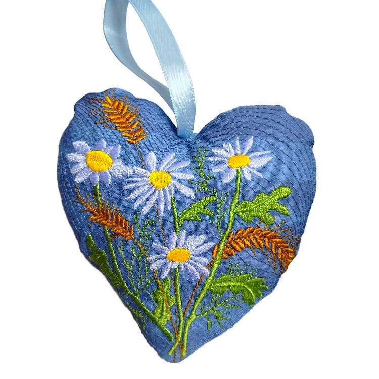 Daisy and wheat handdrawn stuffed ornament that is done in the hoop with a little handsewing inclusion.