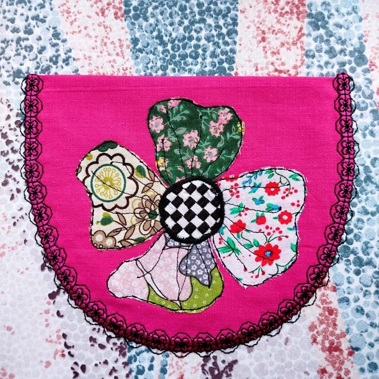 Unique floral applique pocket - stitched in two hoopings and completely in the hoop.