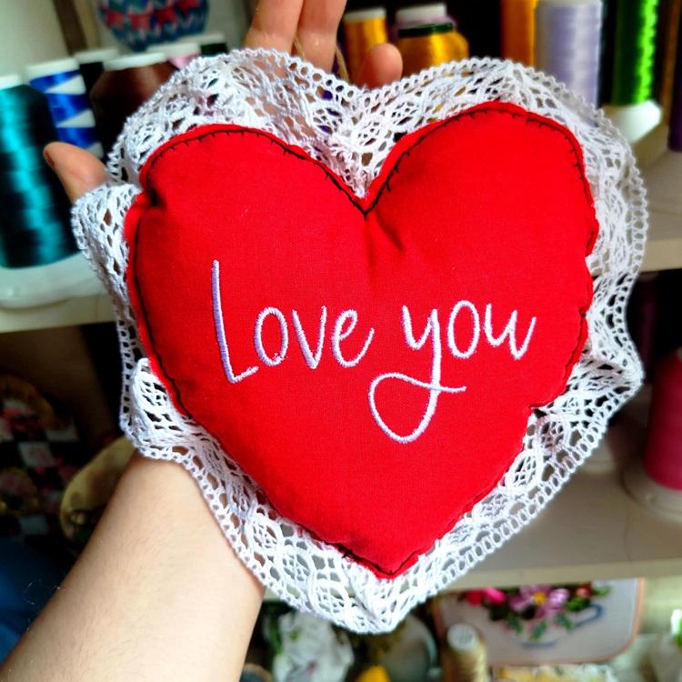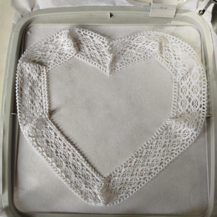 Beautiful valentine heart that has the lace finish - made in the hoop with the little handsewing inclusion.
