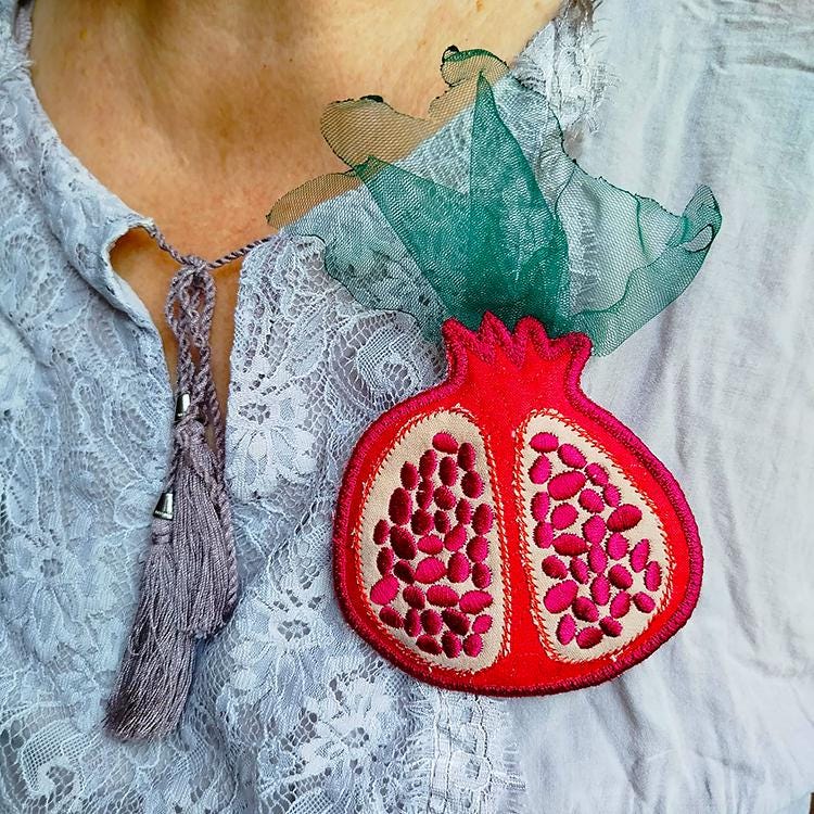 Beautiful stuffed pomegranate brooch - made in one hooping. The stitching is done completely in the hoop, when attaching