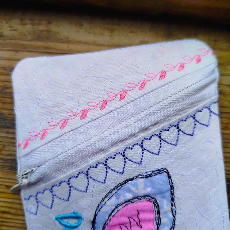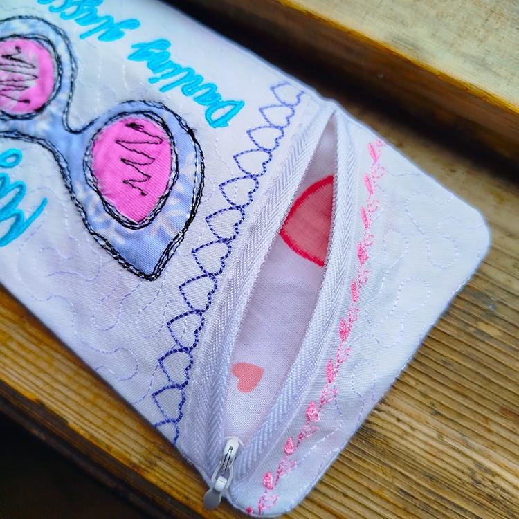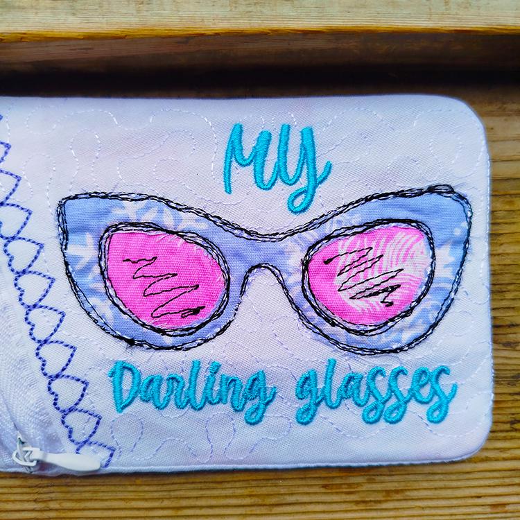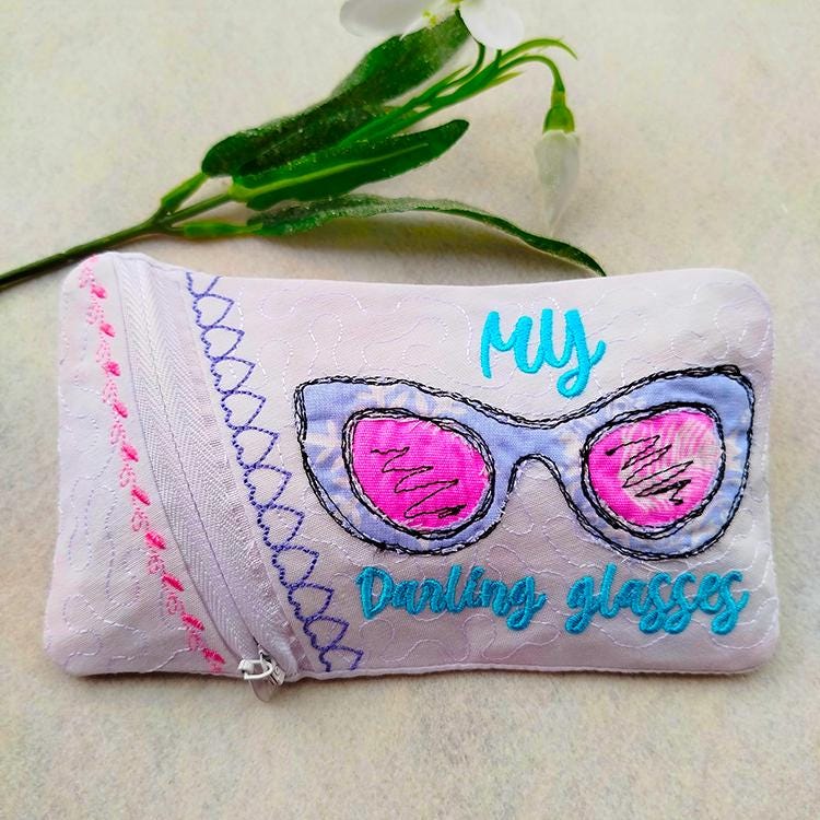 Eyeglasses fully lined zipper case that is made in the hoop with a little handsewing inclusion.