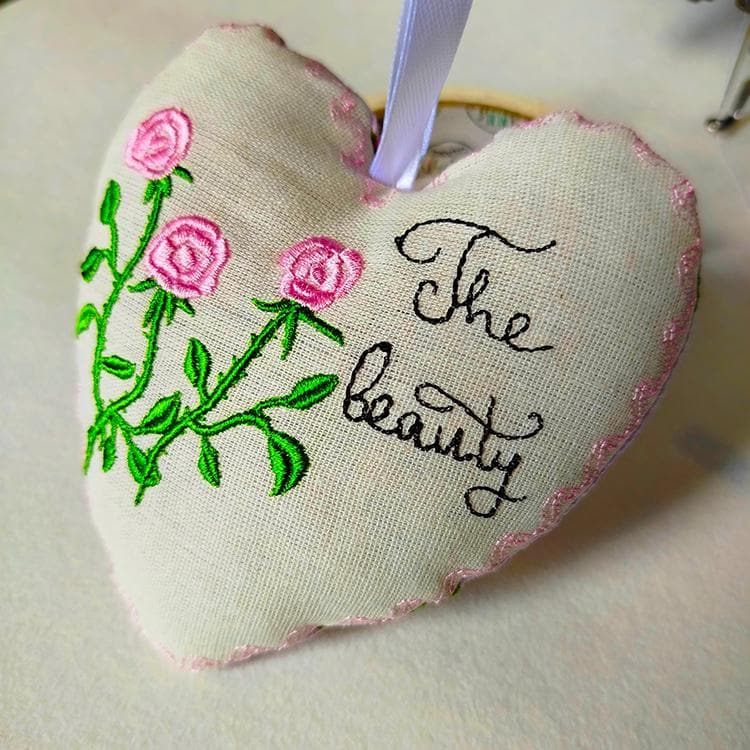 Beautiful handdrawn roses ornament that is done in the hoop with a little handsewing inclusion.