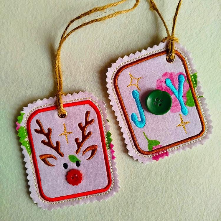Christmas tags - made completely in the hoop and then there is another fun to choose pretty and suitable buttons to hot glue to them. You can do this activity alone or with kids.