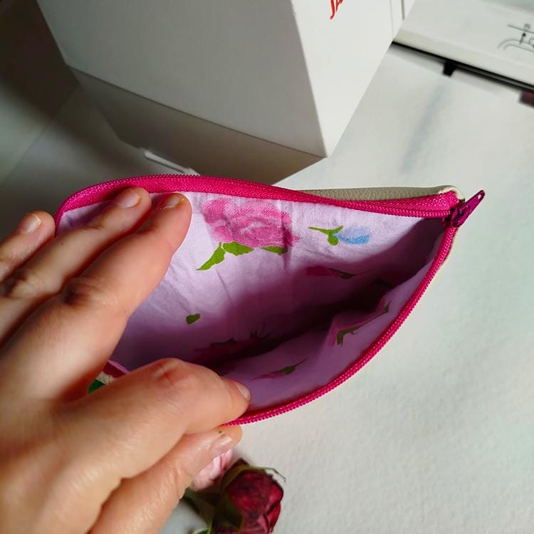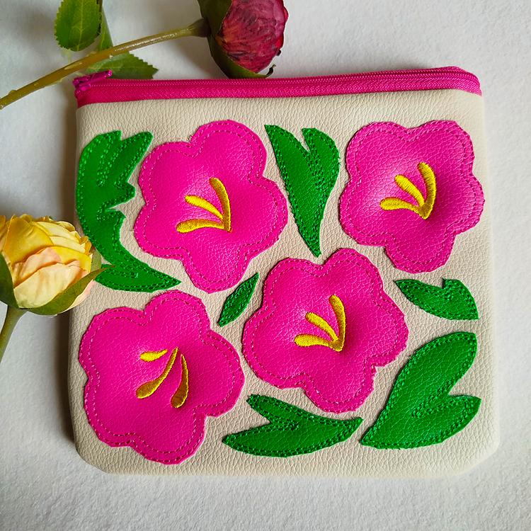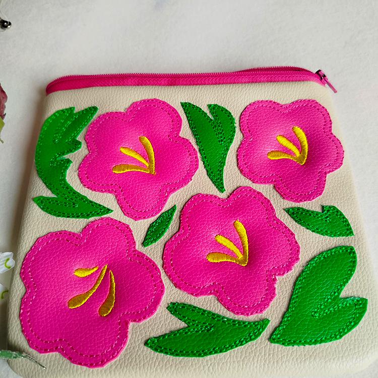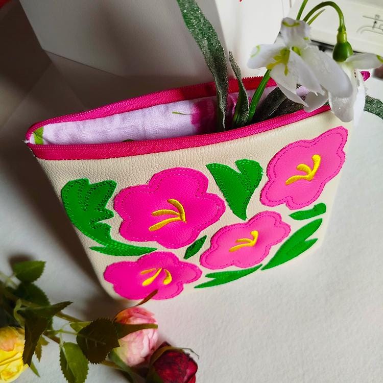 Leather or faux leather fully lined purse that is stitched in the hoop with a little handsewing inclusion.