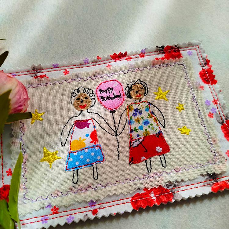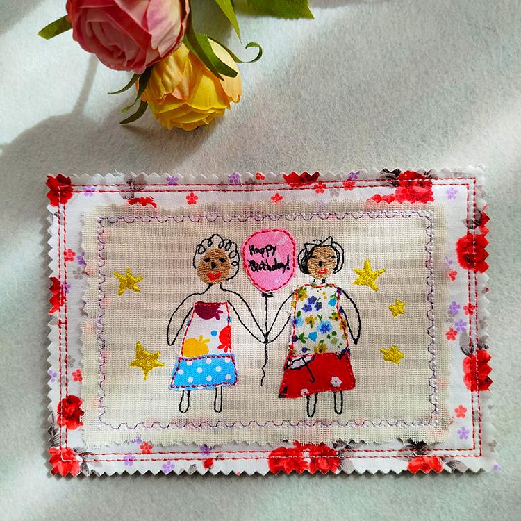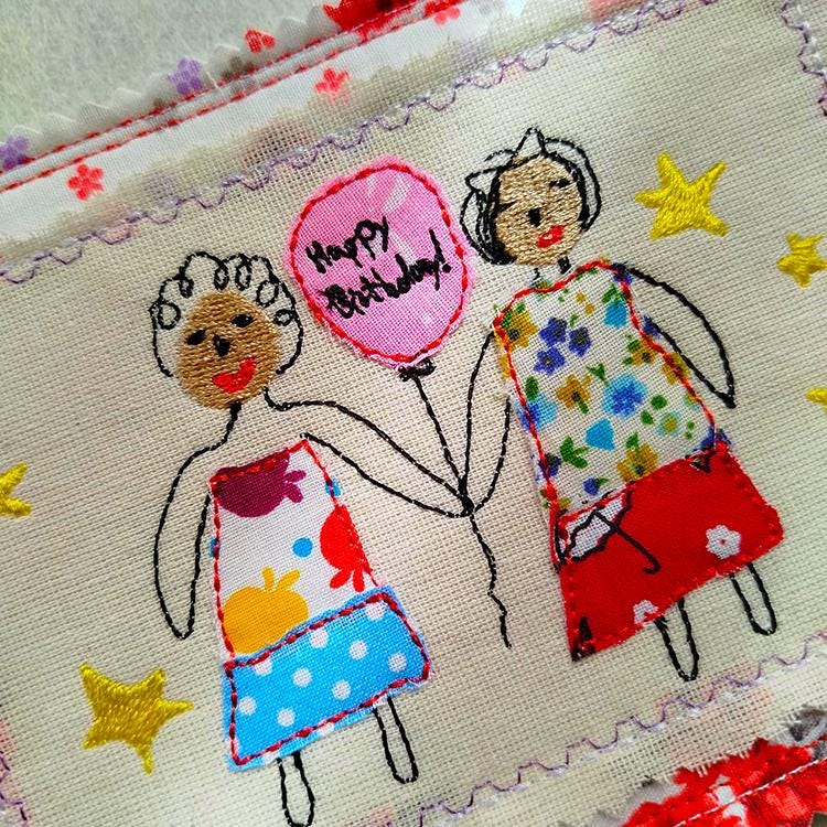 Cute handdrawn friends birthday card that is made completely in the hoop.