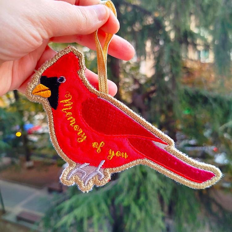 This ornament is done completely in the hoop. I recommend red or burgundy fabric for its applique element.