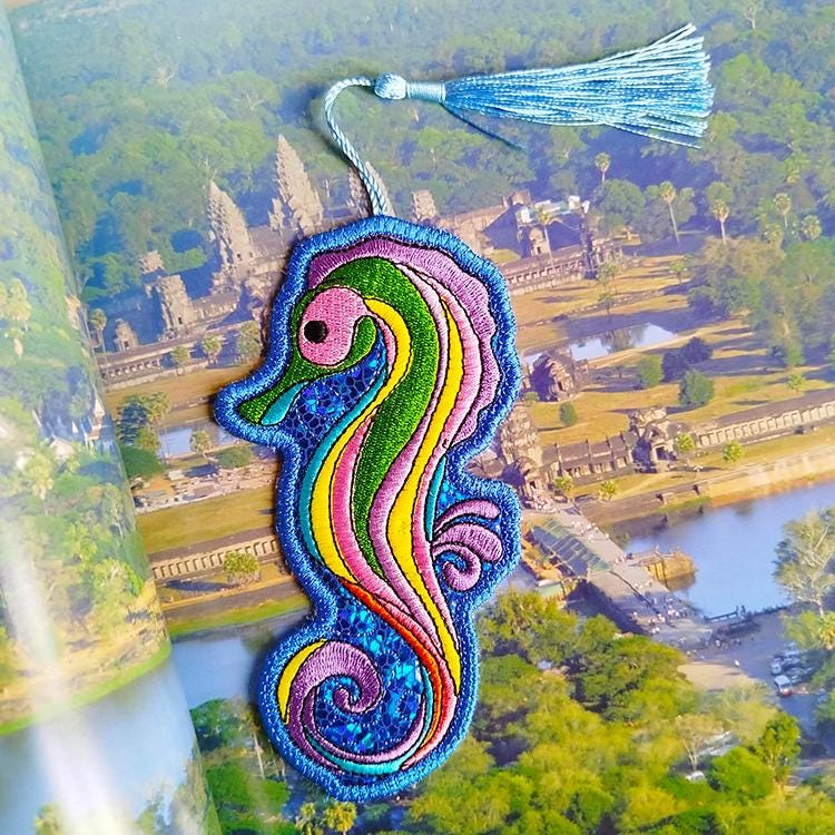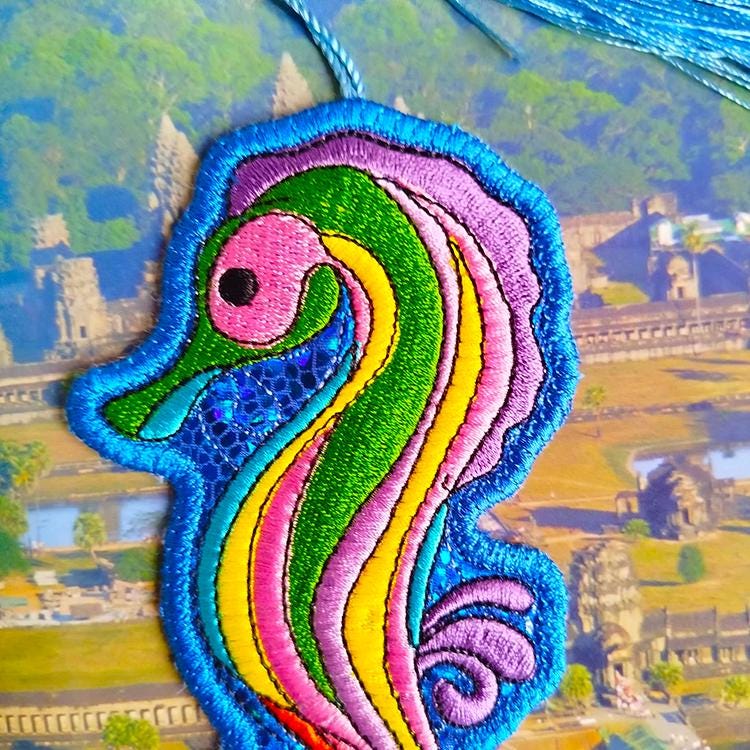 Beautiful and colorful seahorse Bookmark that is done completely in the hoop.