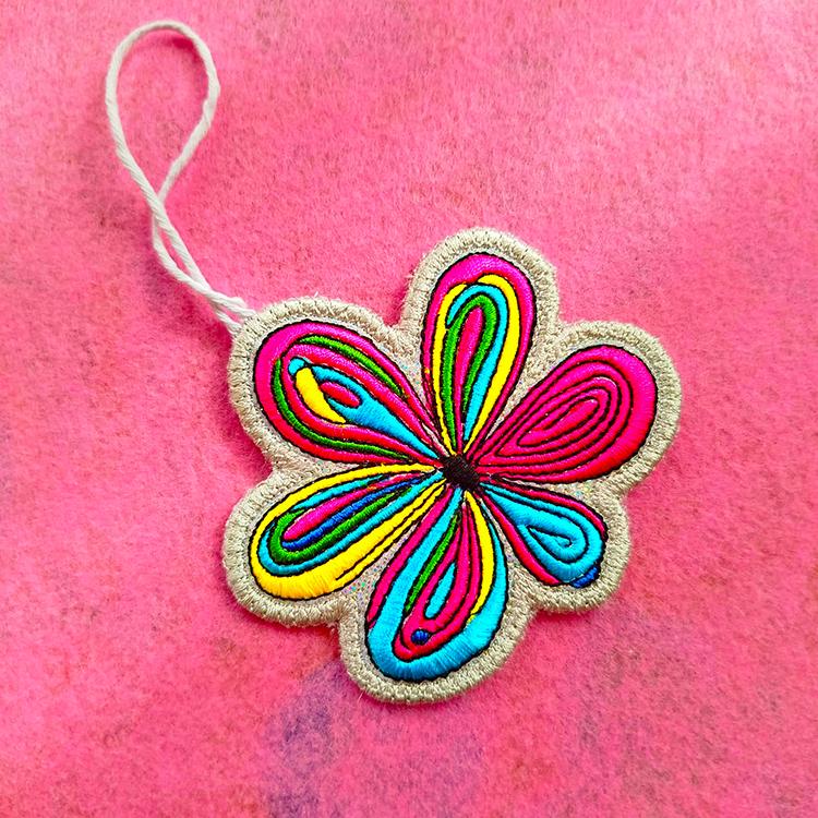 Floral design that is made completely in the hoop into an ornament or a tag.
