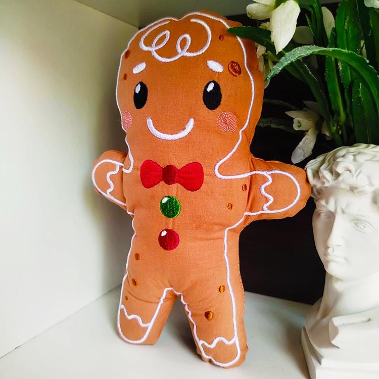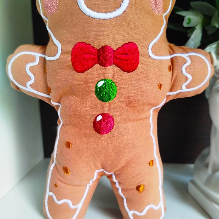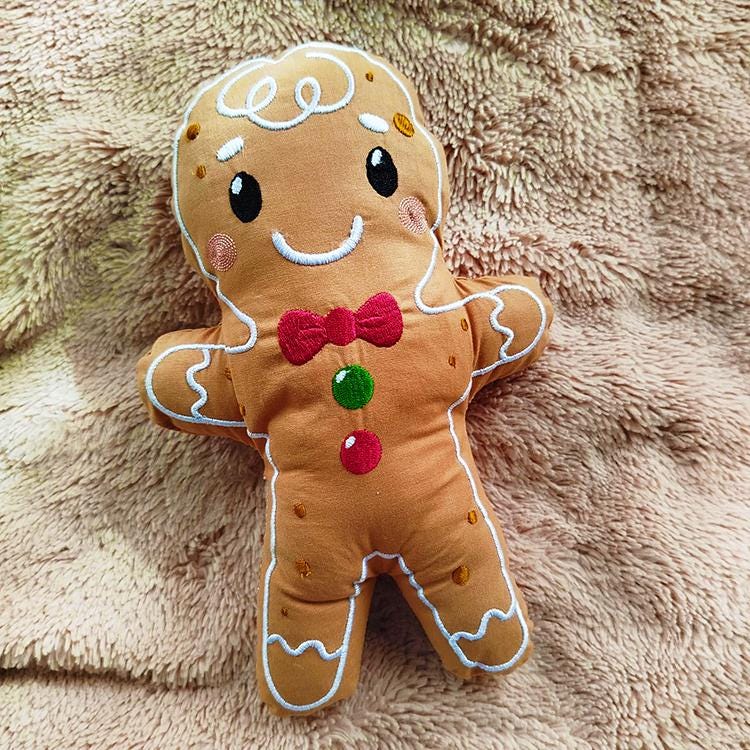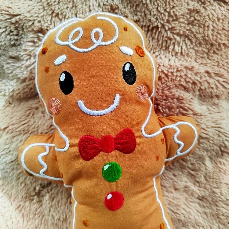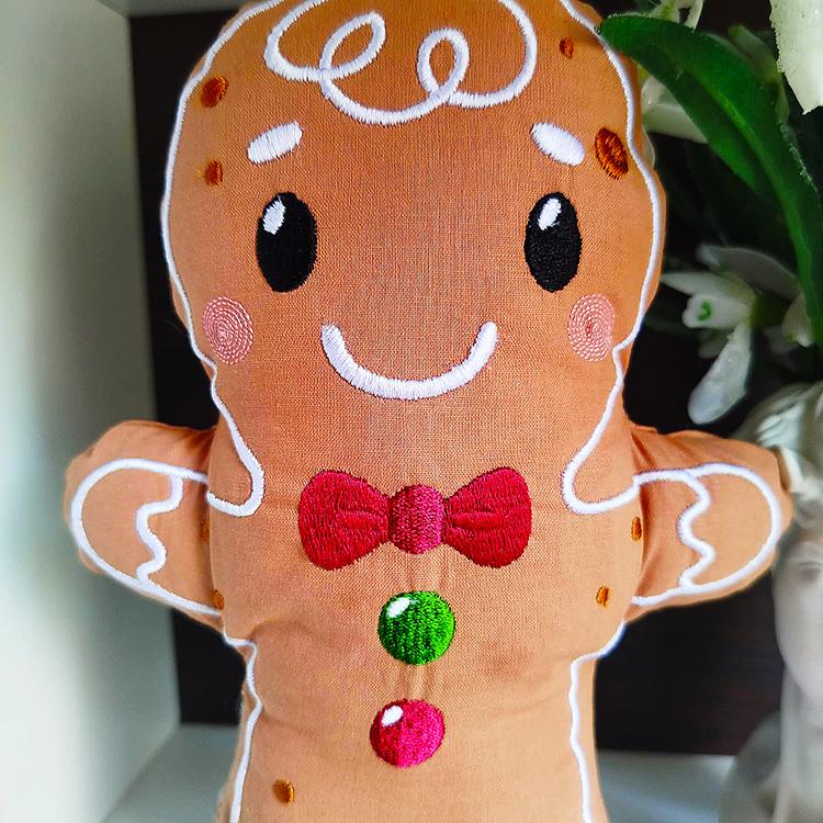 Sweet gingerbread stuffie that is made in the hoop with a little handsewing inclusion.