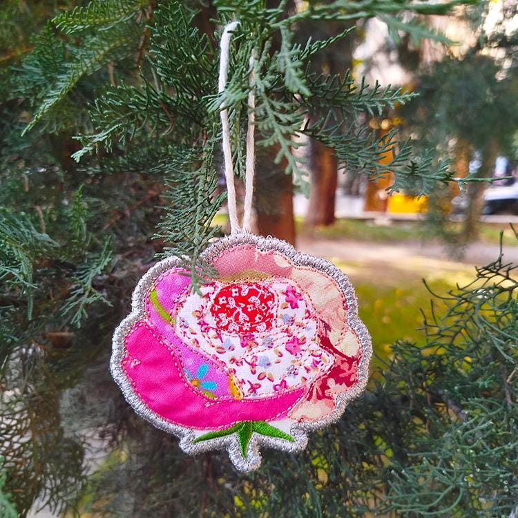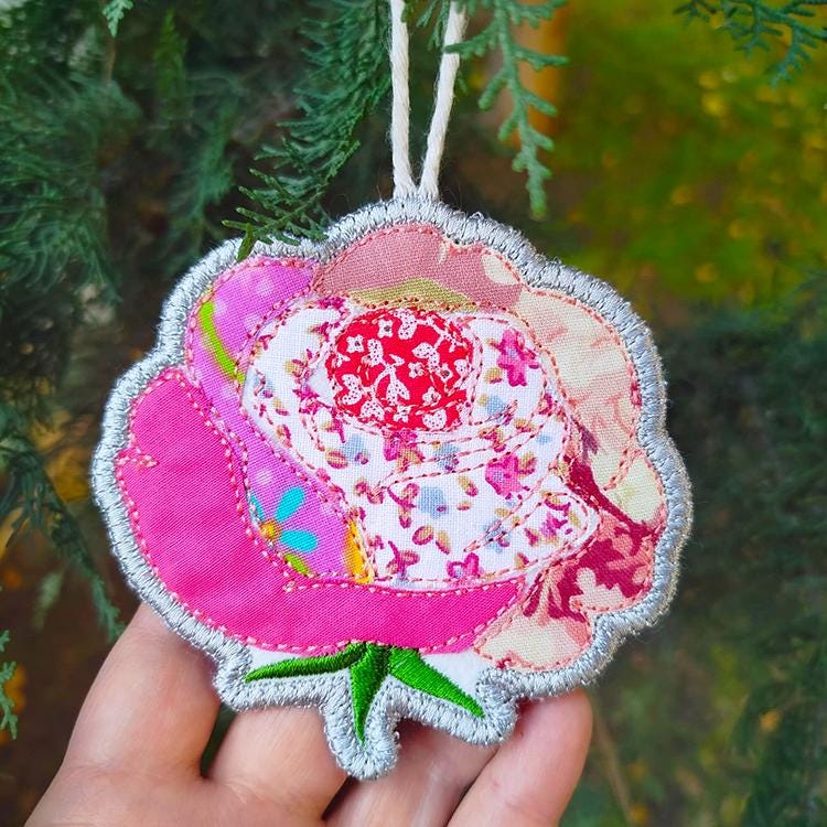 Rose applique ornament that is made completely in the hoop.