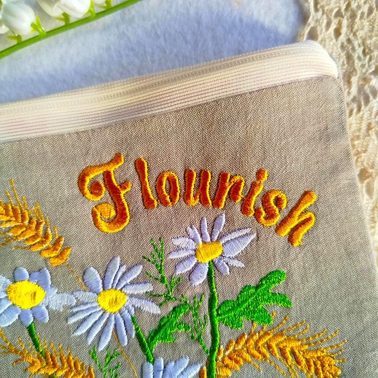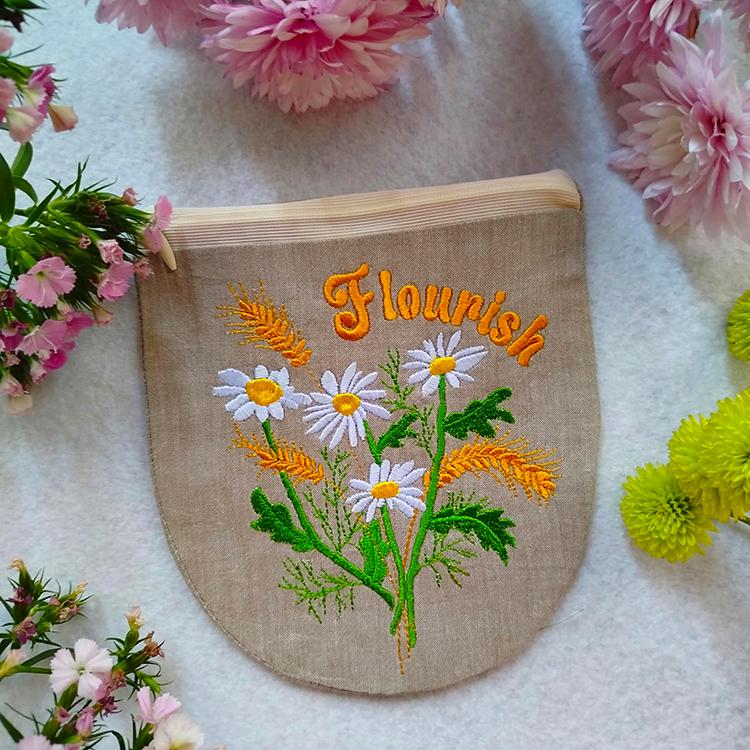 Fully lined floral handdrawn purse that is made in the hoop with a little handsewing inclusion.