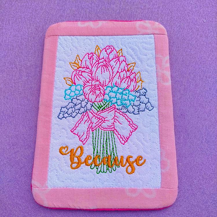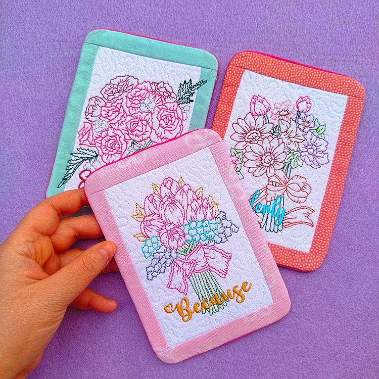 Dainty and feminine pocket back mugrugs stitched completely in the hoop.