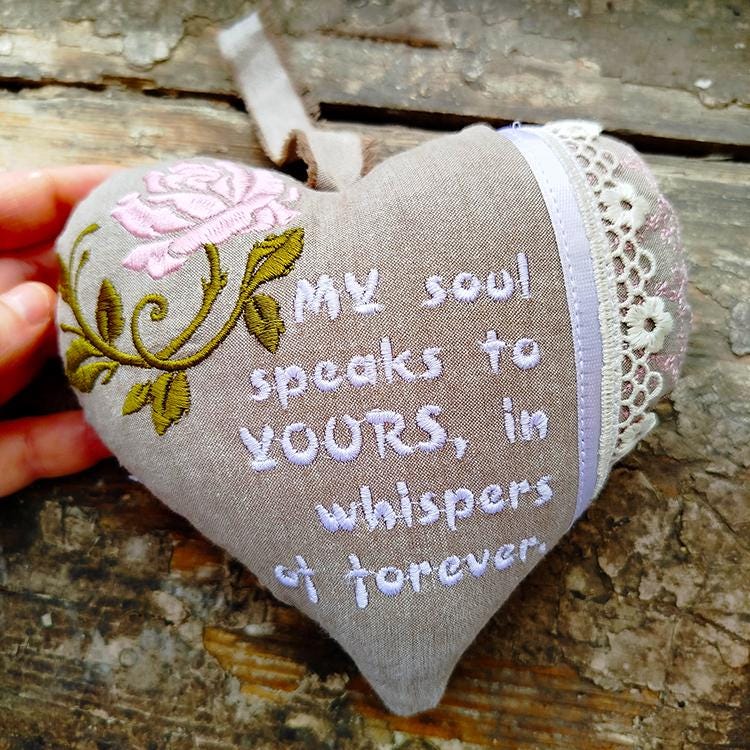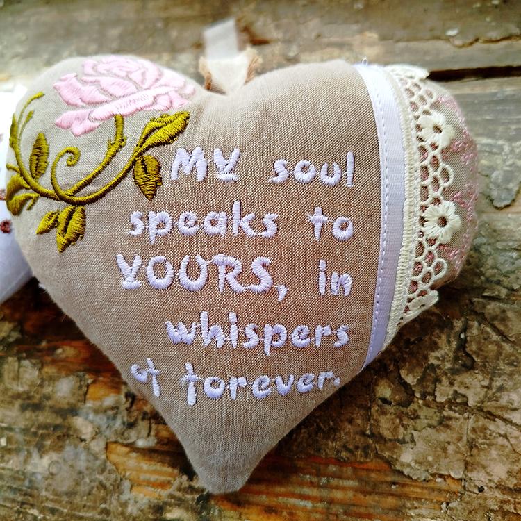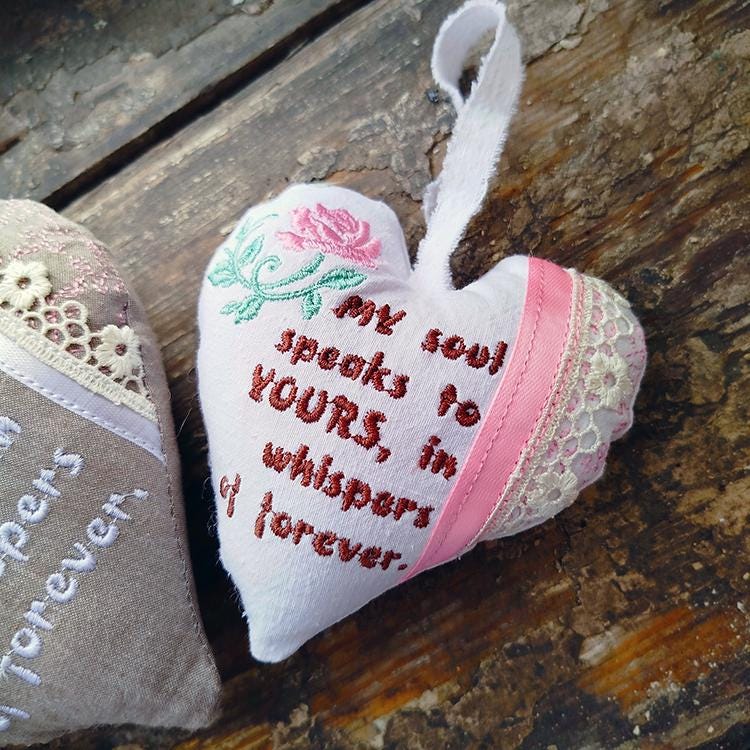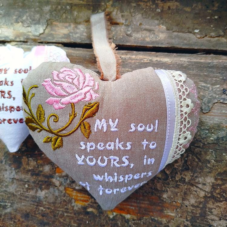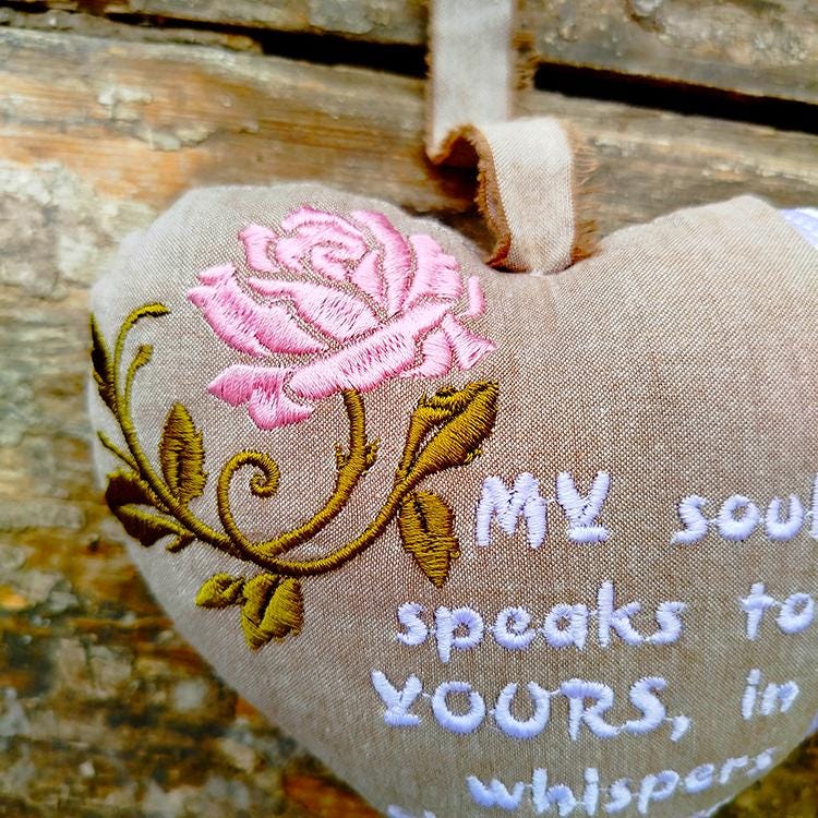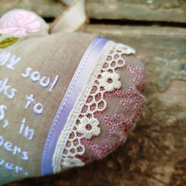 This heart comes in two sizes. It requires ribbon and lace to attach them in the hoop.