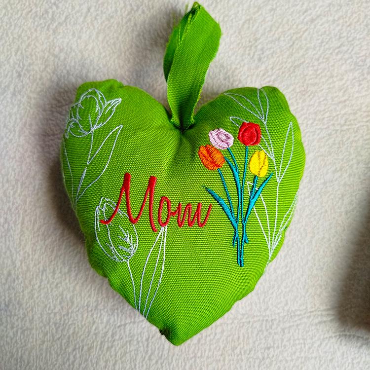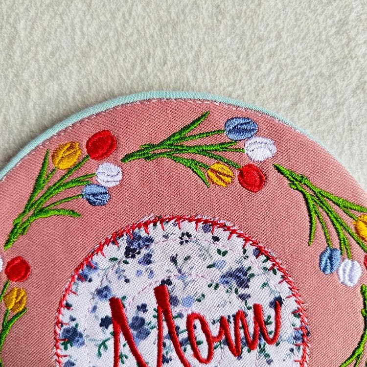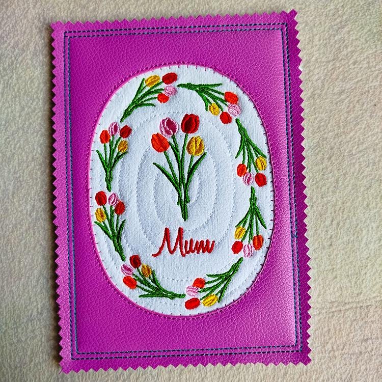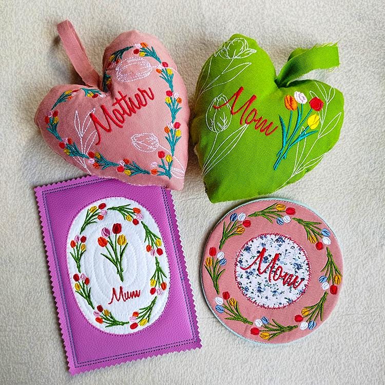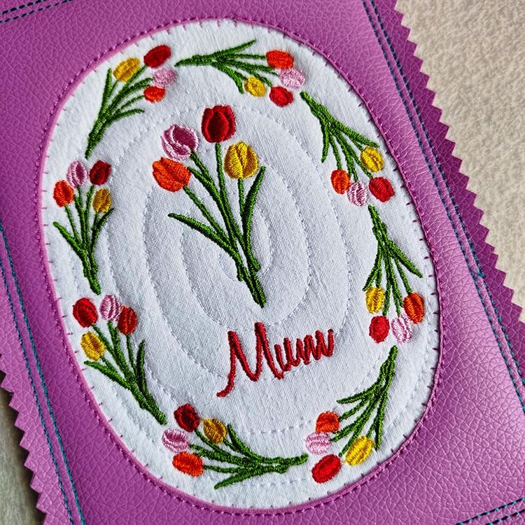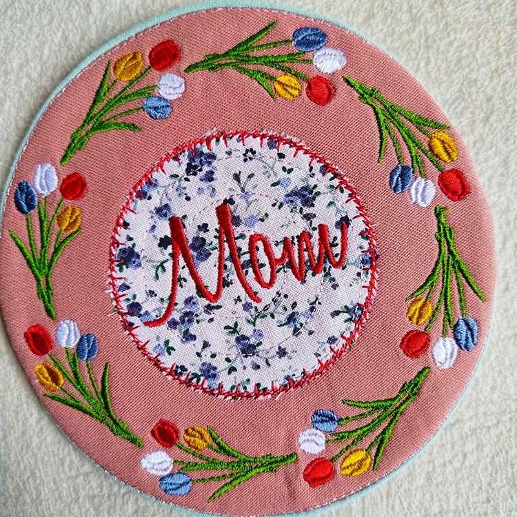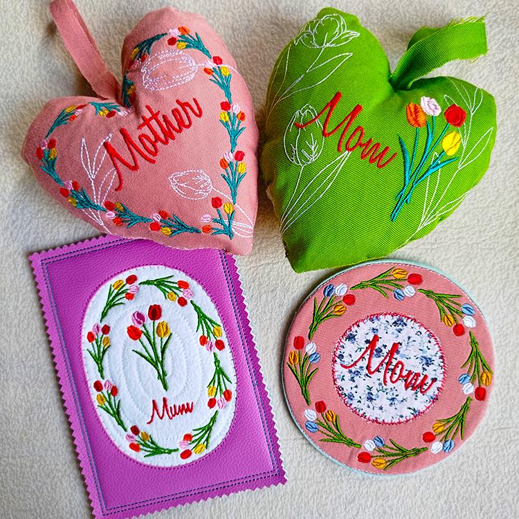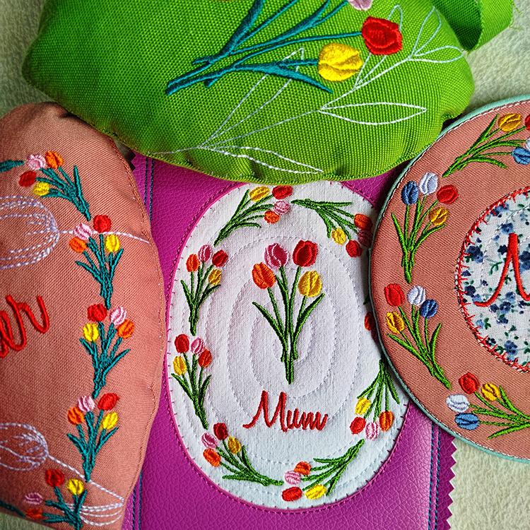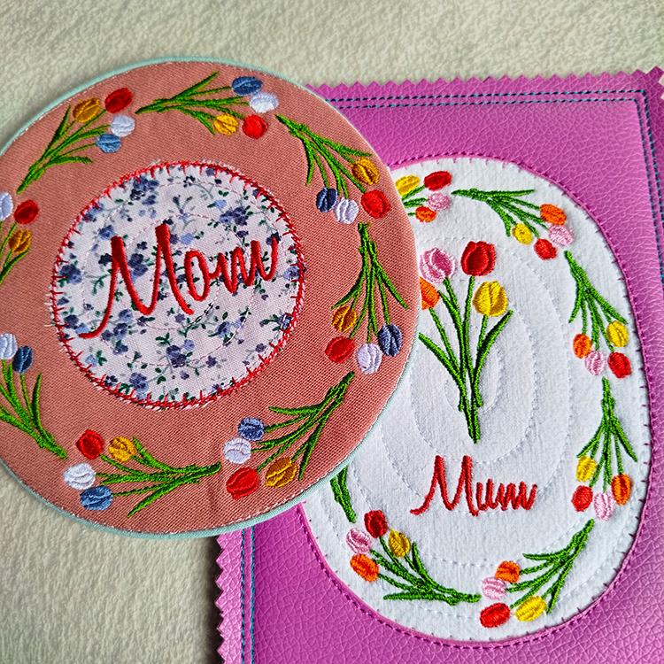 Mothers day items with tulips those are made completely in the hoop (card, coaster) or with a little handsewing inclusion (coaster).