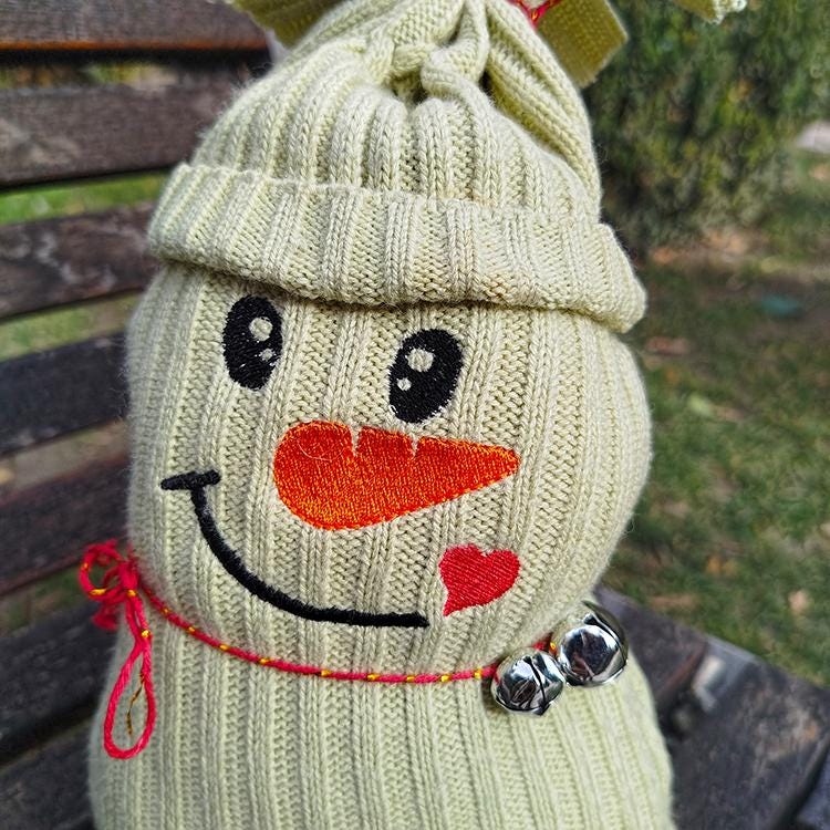 Make your own huge sock snowman out of knit jacket in the hoop with a little handsewing inclusion.