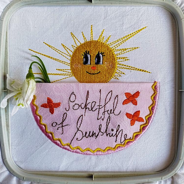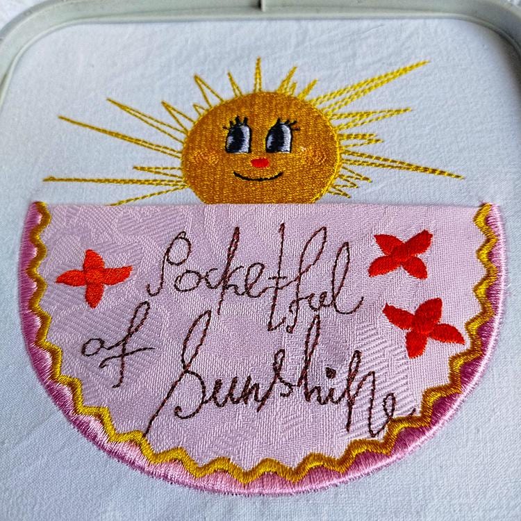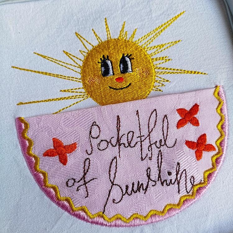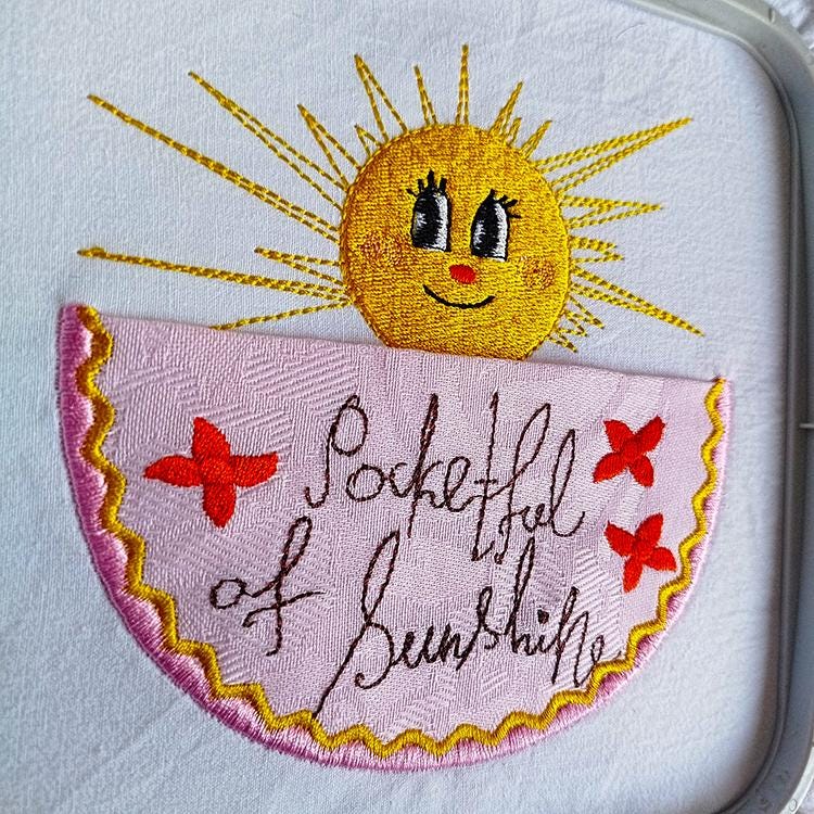 Beautiful sunshine handdrawn pocket that is made in two hoopings.