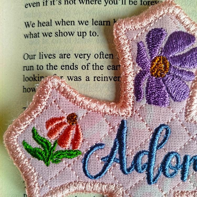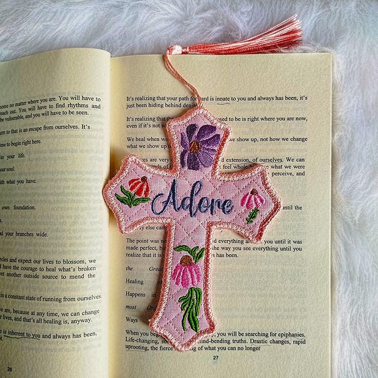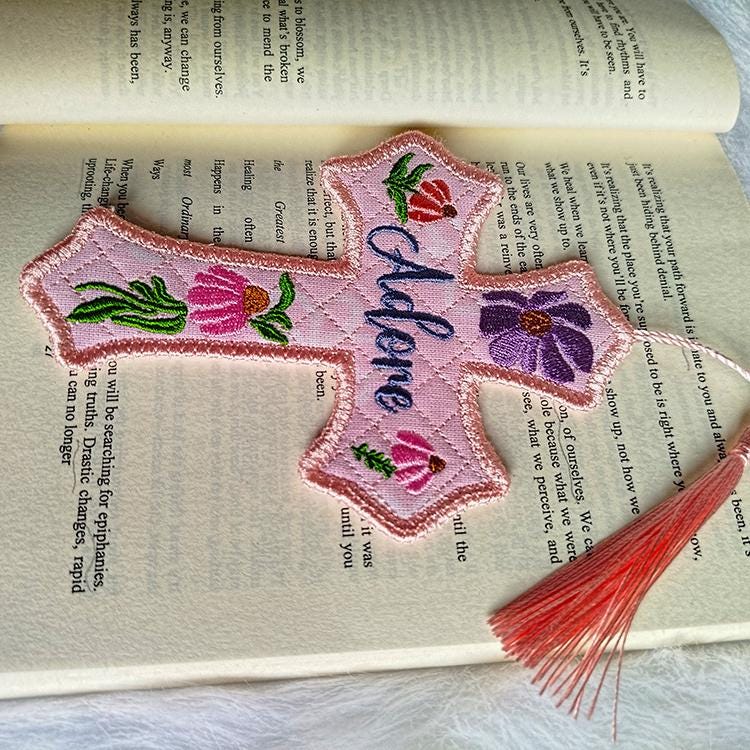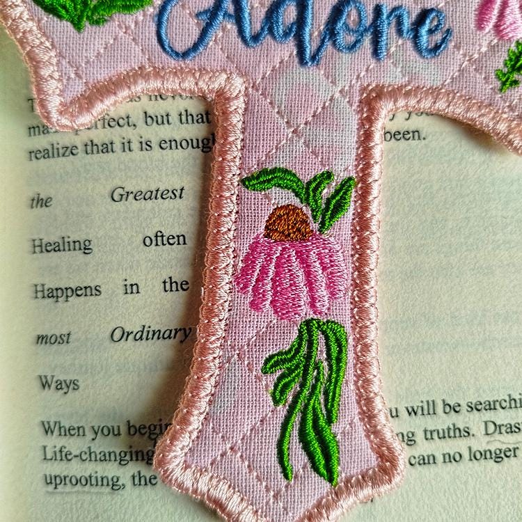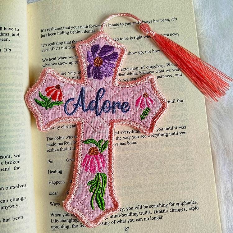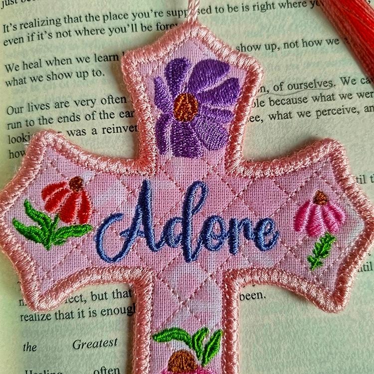 Floral and inspirational cross bookmark that is made completely in the hoop.